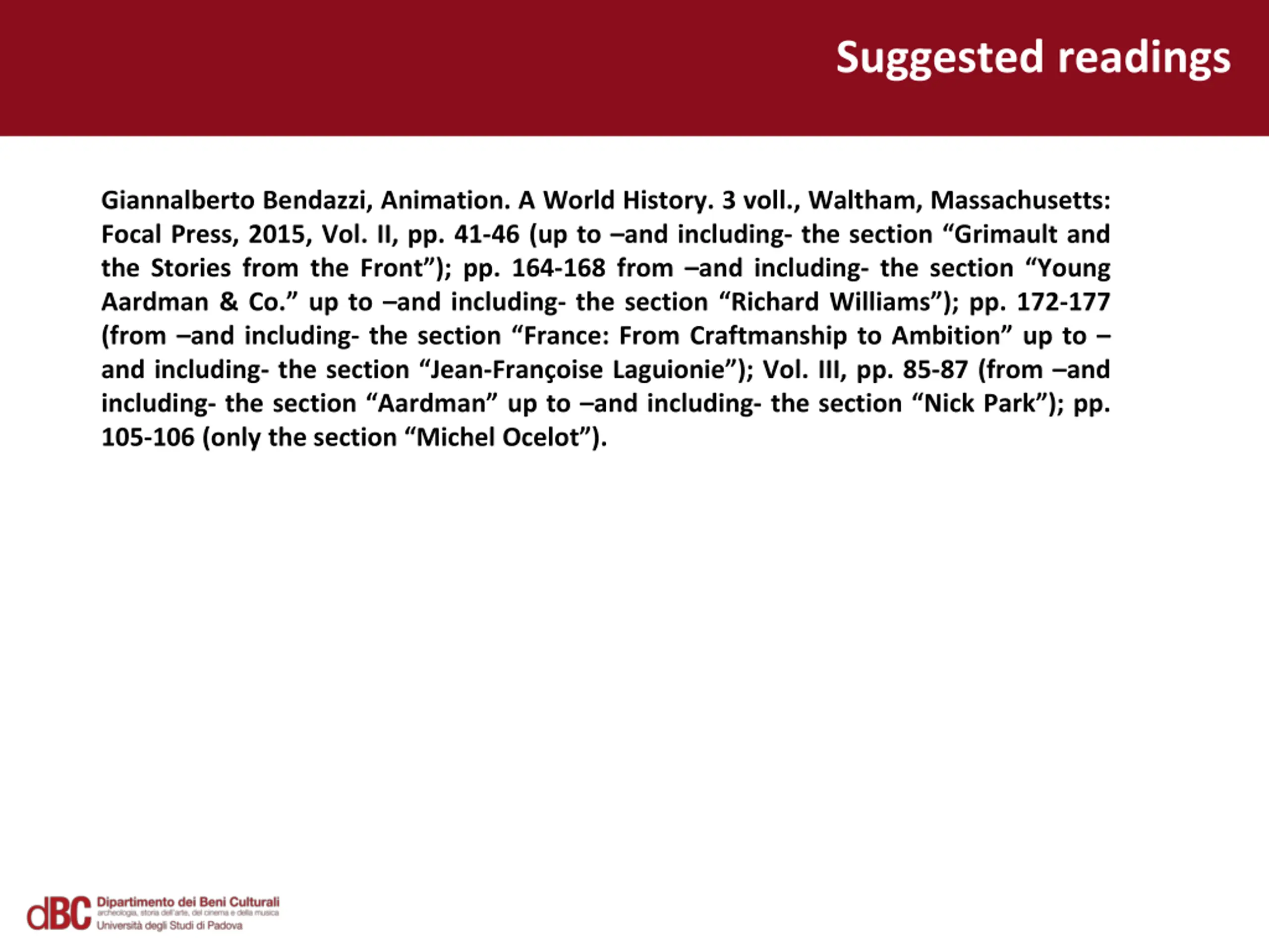 Suggested readings Giannalberto Bendazzi, Animation. A World History. 3 voll., Waltham, Massachusetts: Focal Press, 2015, Vol. II, pp. 41-46 (up to and including- the section Grimault and the Stories from the Front ); pp. 164-168 from and including- the section Young Aardman & Co. up to and including- the section RichardWilliams ); pp. 172-177 (from and including- the section France: From Craftmanship to Ambition up to and including- the section Jean-Fran oise Laguionie ); Vol. III, pp. 85-87 (from and including- the section Aardman up to and including- the section NickPark ); pp. 105-106 (only the section MichelOcelot ).