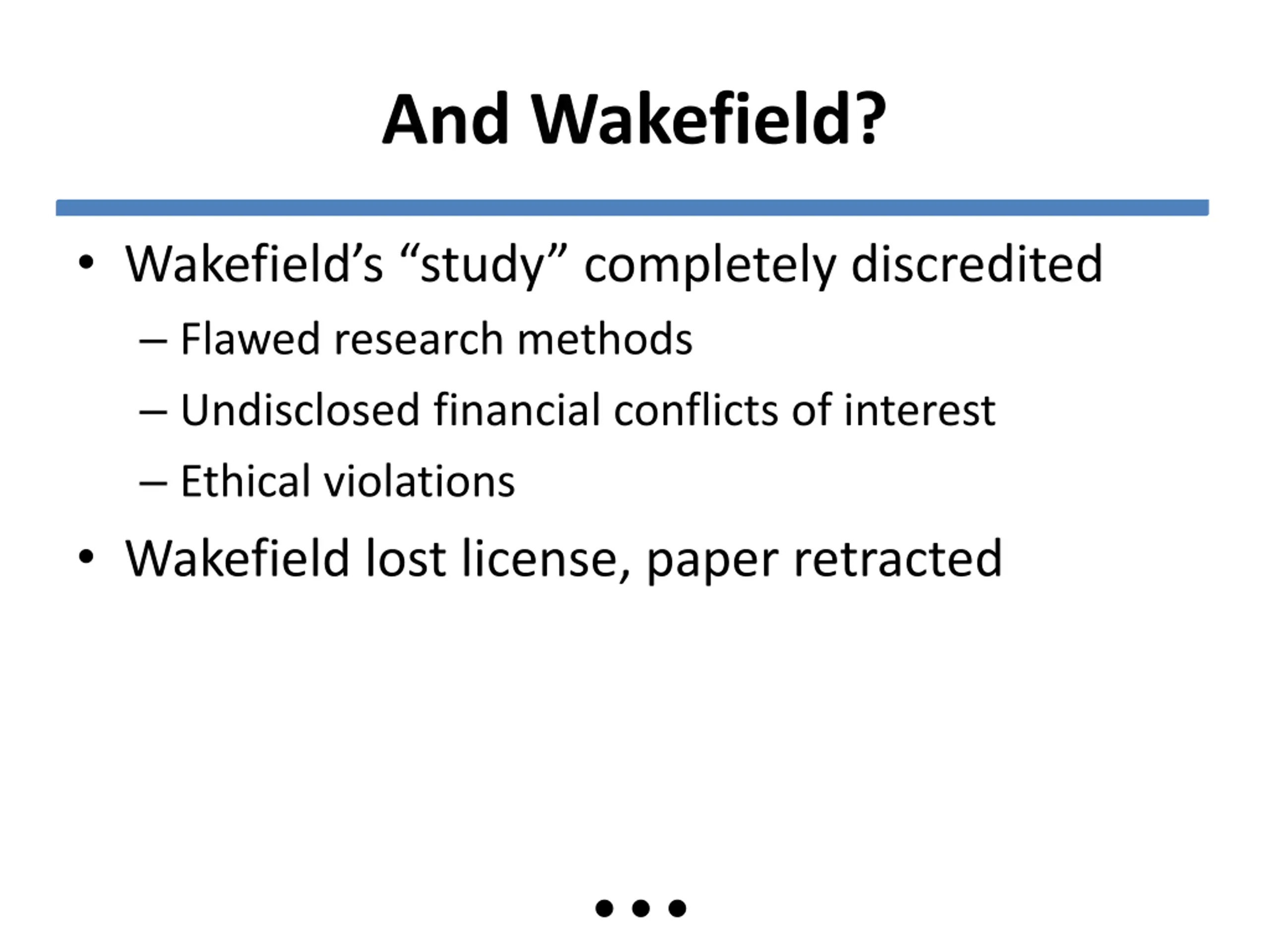 And Wakefield? Wakefield s study completely discredited Flawed research methods Undisclosed financial conflicts of interest Ethical violations Wakefield lost license, paper retracted