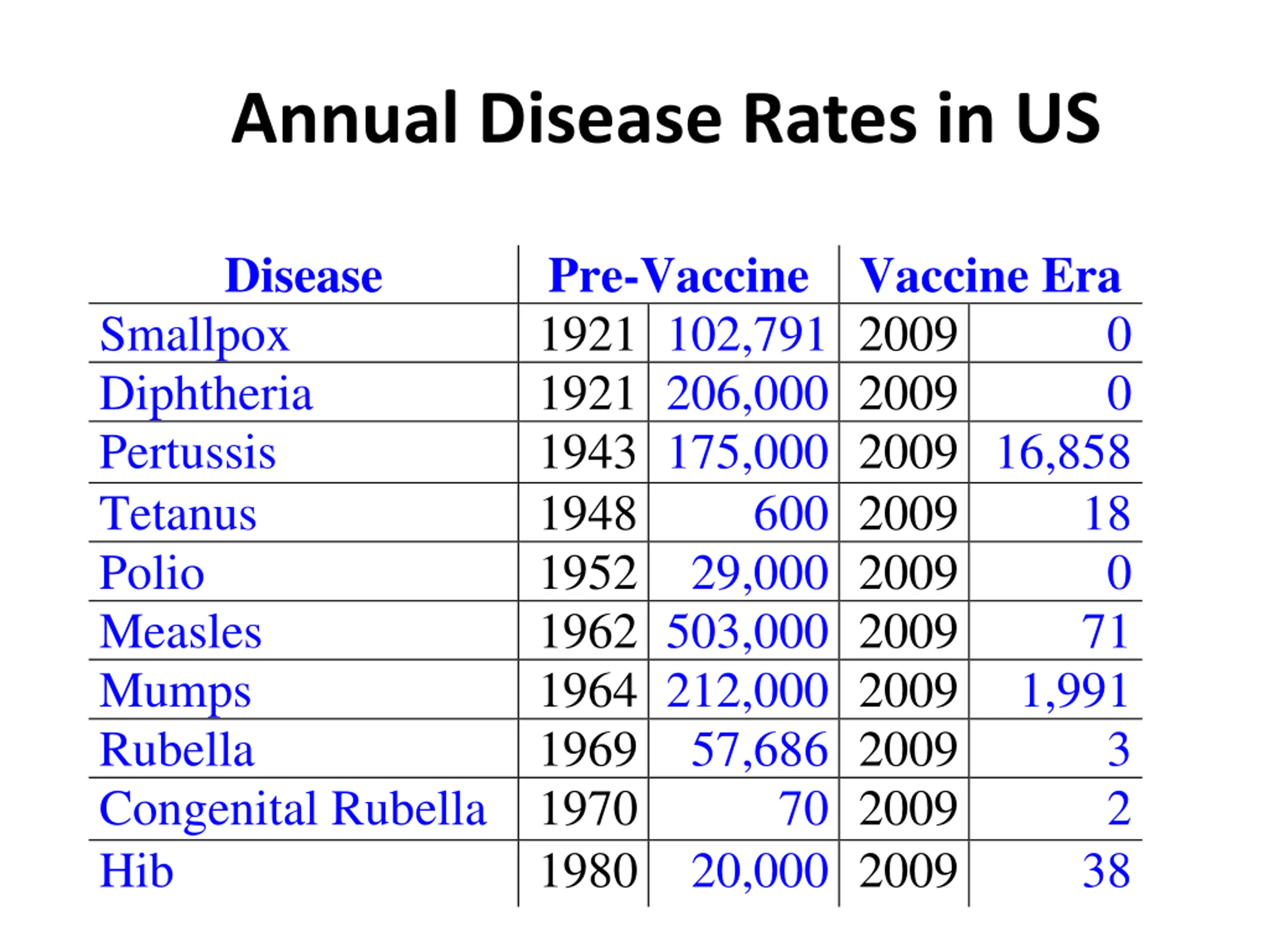 Annual Disease Rates in US Disease Pre-Vaccine Vaccine Era 1921 102,791 2009 1921 206,000 2009 1943 175,000 2009 16,858 1948 600 2009 1952 29,000 2009 1962 503,000 2009 1964 212,000 2009 1969 57,686 2009 70 2009 1980 20,000 2009 Smallpox Diphtheria Pertussis Tetanus Polio Measles Mumps Rubella Congenital Rubella 1970 Hib 0 0 18 0 71 1,991 3 2 38