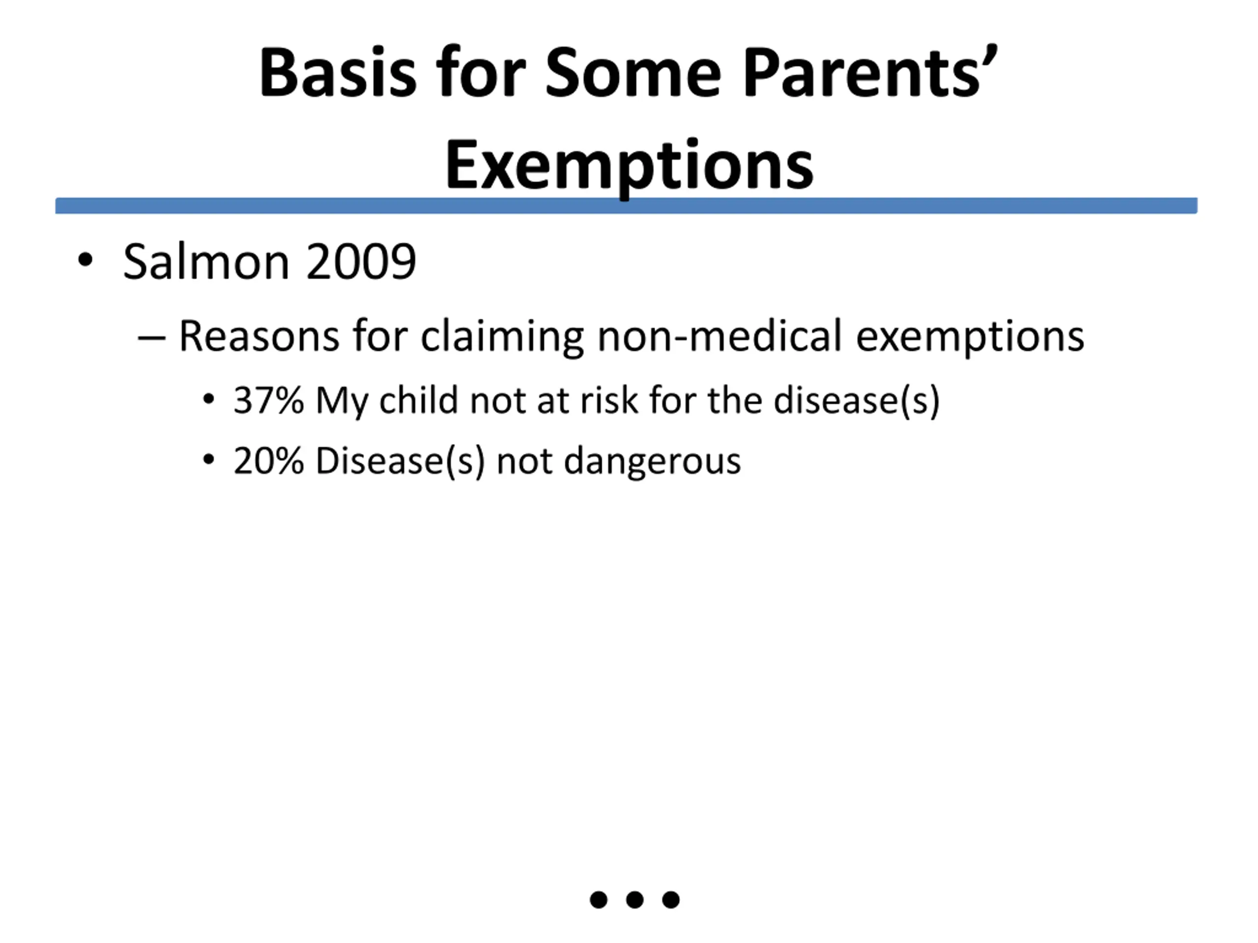Basis for Some Parents Exemptions Salmon 2009 Reasons for claiming non-medical exemptions 37% My child not at risk for the disease(s) 20% Disease(s) not dangerous