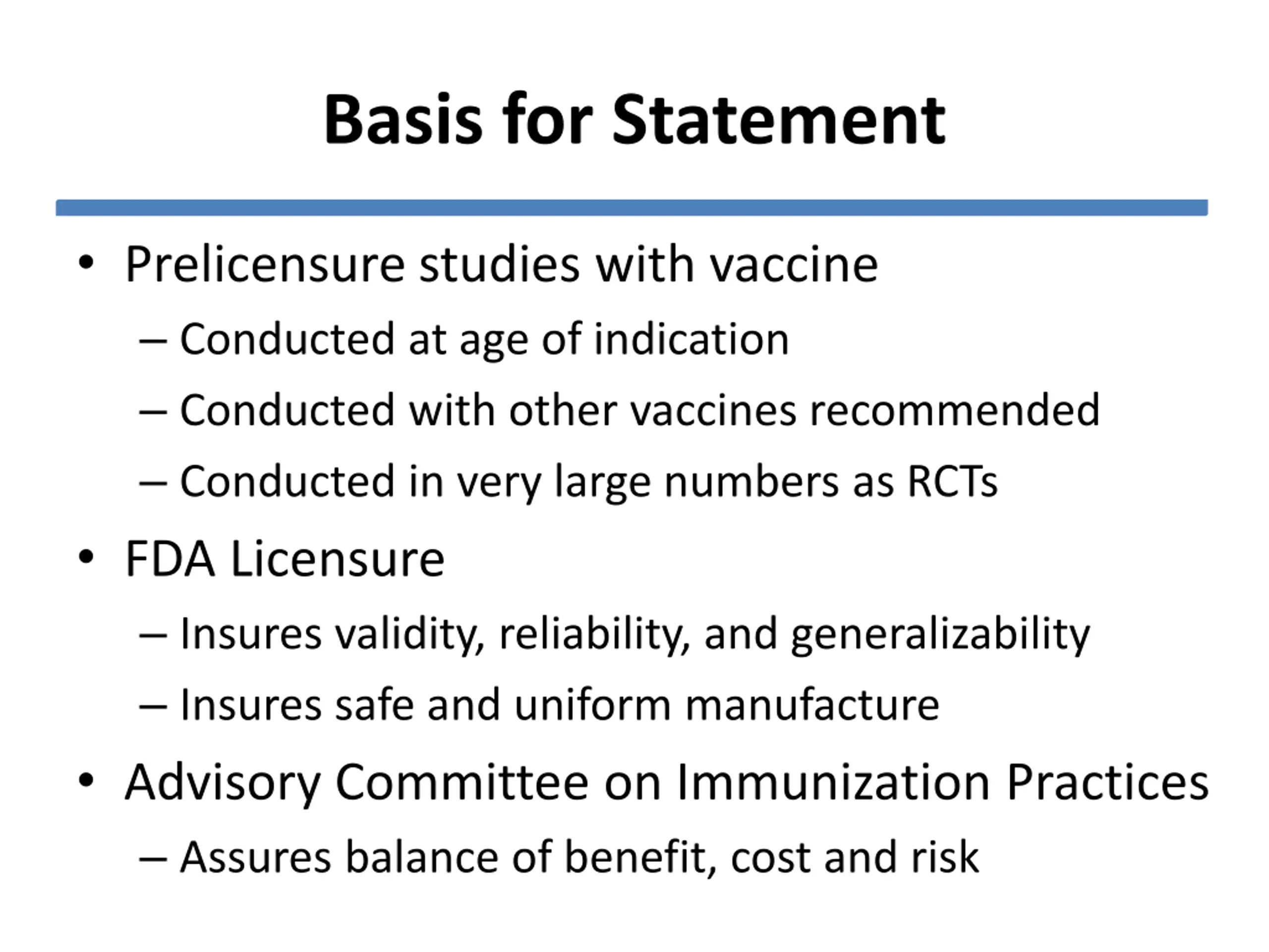 Basis for Statement Prelicensure studies with vaccine Conducted at age of indication Conducted with other vaccines recommended Conducted in very large numbers as RCTs FDA Licensure Insures validity, reliability, and generalizability Insures safe and uniform manufacture Advisory Committee on Immunization Practices Assures balance of benefit, cost and risk