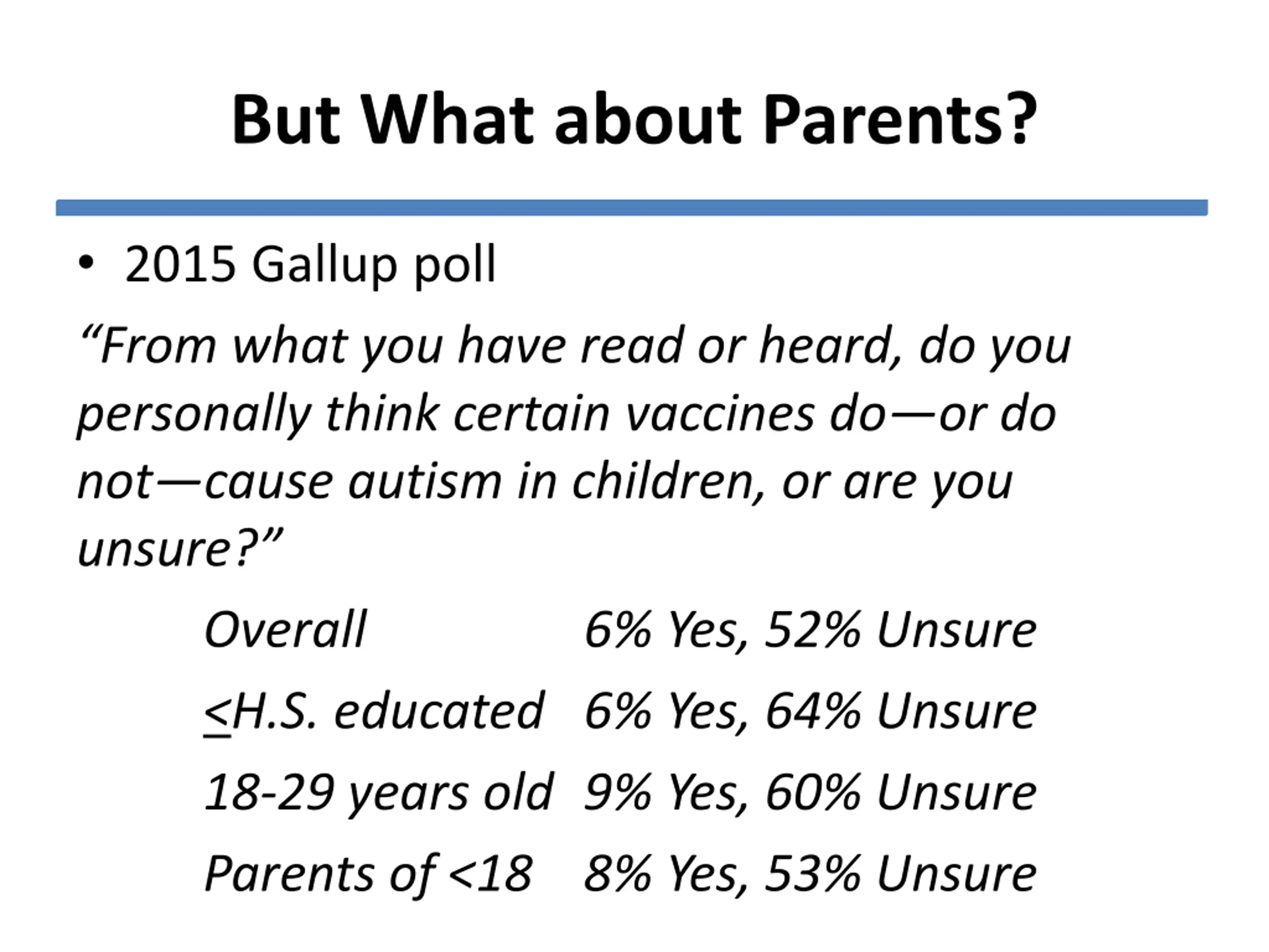 But What about Parents? 2015 Gallup poll From what you have read or heard, do you personally think certain vaccines do or do not cause autism in children, or are you unsure? Overall <H.S. educated 6% Yes, 64% Unsure 18-29 years old 9% Yes, 60% Unsure Parents of <18 8% Yes, 53% Unsure 6% Yes, 52% Unsure