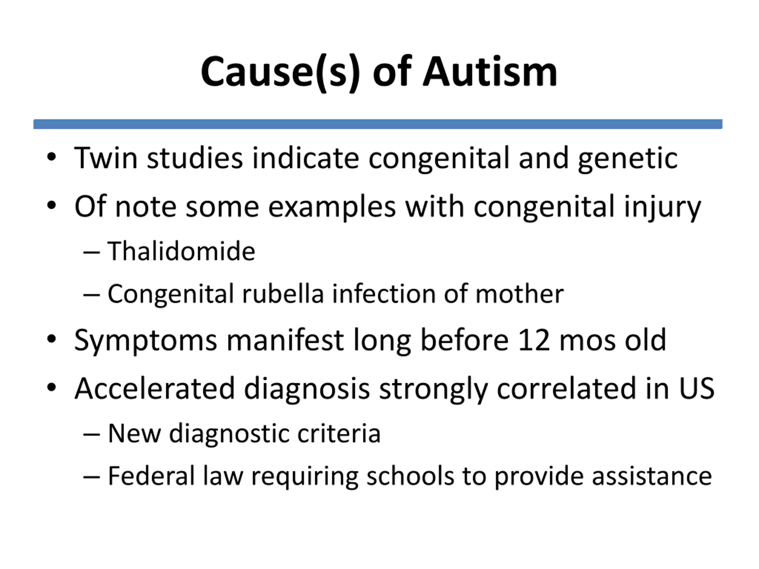 Cause(s) of Autism Twin studies indicate congenital and genetic Of note some examples with congenital injury Thalidomide Congenital rubella infection of mother Symptoms manifest long before 12 mos old Accelerated diagnosis strongly correlated in US New diagnostic criteria Federal law requiring schools to provide assistance