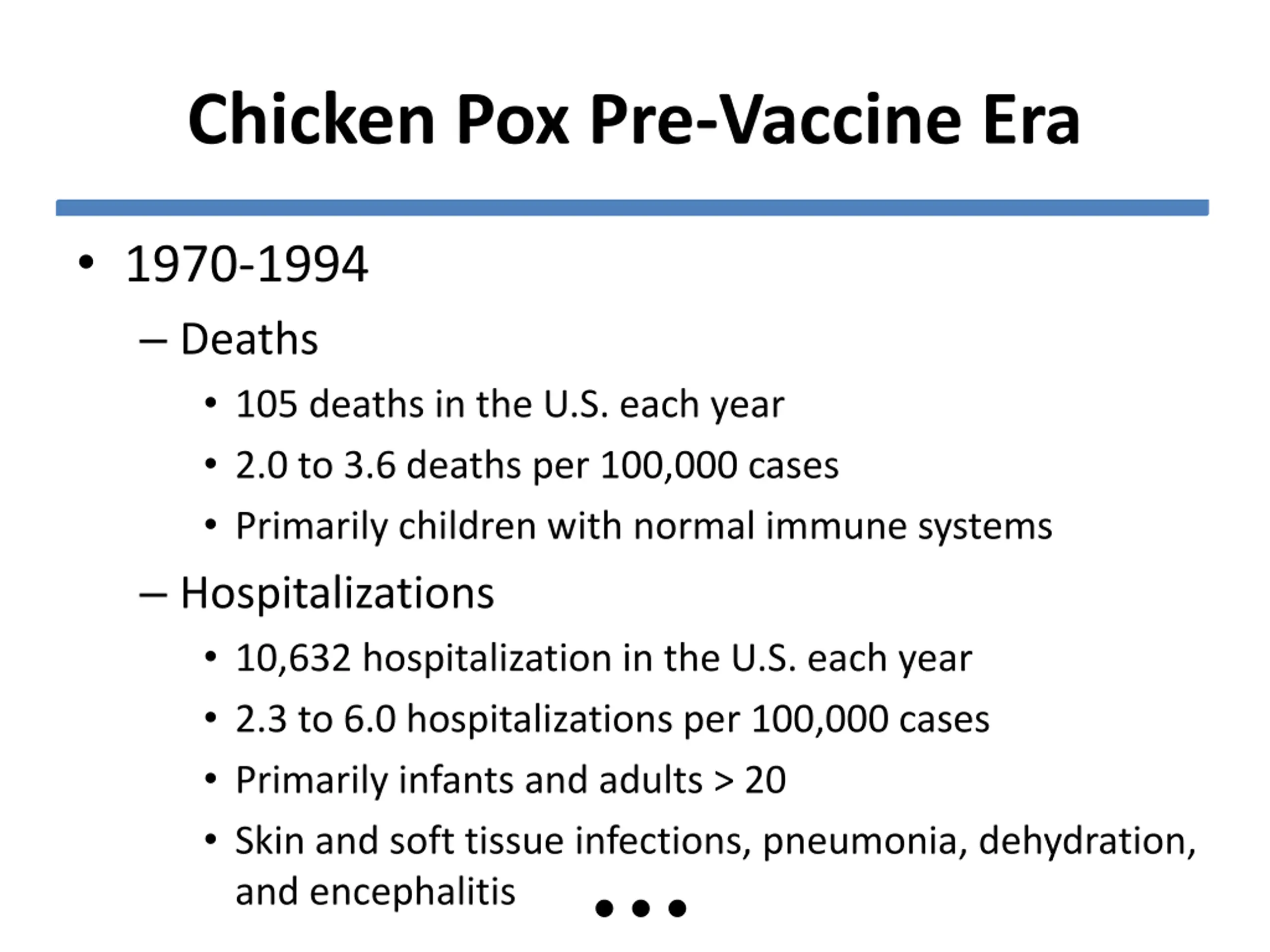 Chicken Pox Pre-Vaccine Era 1970-1994 Deaths 105 deaths in the U.S. each year 2.0 to 3.6 deaths per 100,000 cases Primarily children with normal immune systems Hospitalizations 10,632 hospitalization in the U.S. each year 2.3 to 6.0 hospitalizations per 100,000 cases Primarily infants and adults > 20 Skin and soft tissue infections, pneumonia, dehydration, and encephalitis