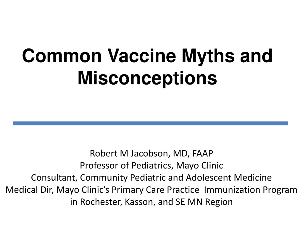 Common Vaccine Myths and Misconceptions Robert M Jacobson, MD, FAAP Professor of Pediatrics, Mayo Clinic Consultant, Community Pediatric and Adolescent Medicine Medical Dir, Mayo Clinic s Primary Care Practice Immunization Program in Rochester, Kasson, and SE MN Region
