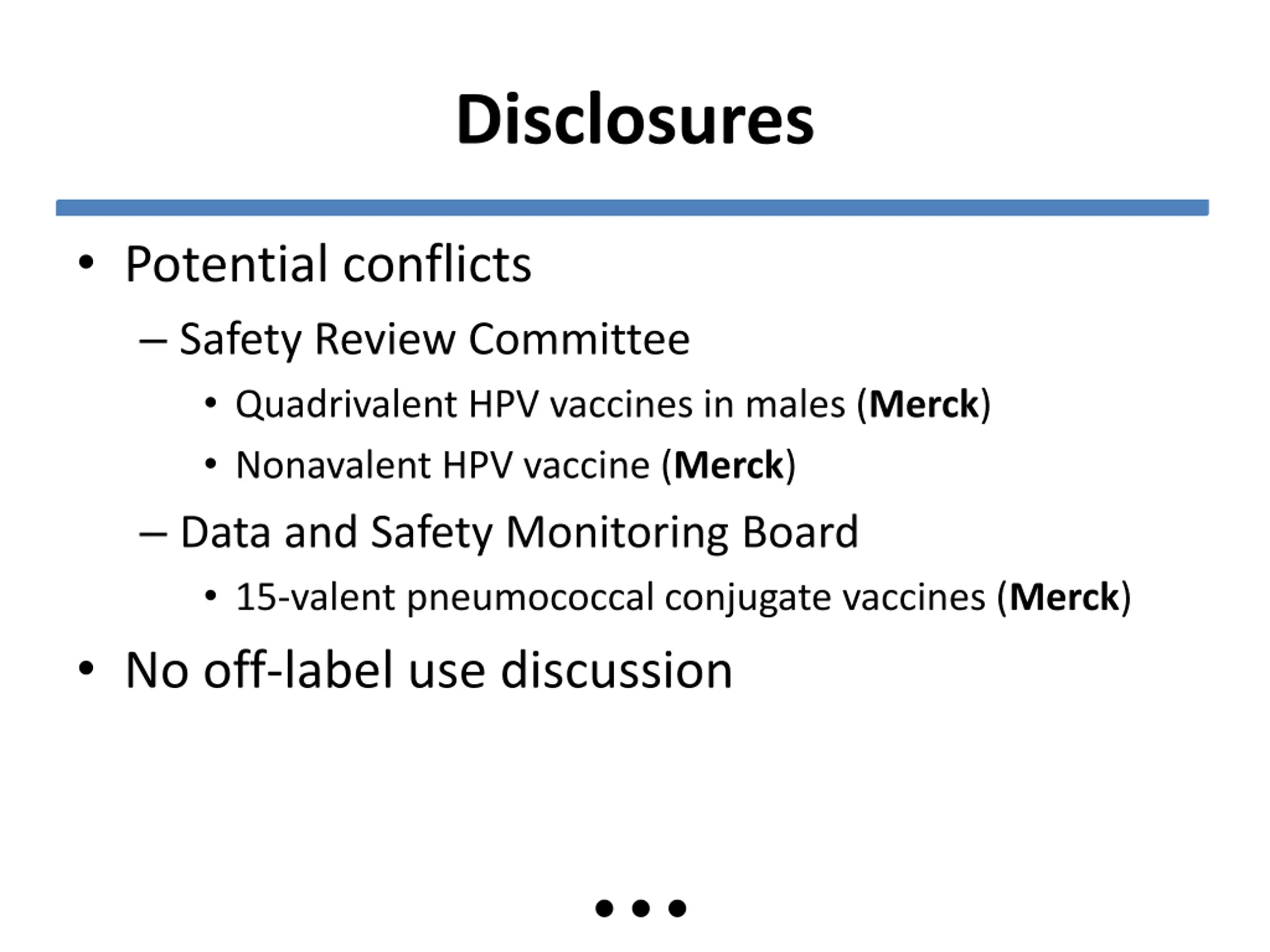 Disclosures Potential conflicts Safety Review Committee Quadrivalent HPV vaccines in males (Merck) Nonavalent HPV vaccine (Merck) Data and Safety Monitoring Board 15-valent pneumococcal conjugate vaccines (Merck) No off-label use discussion