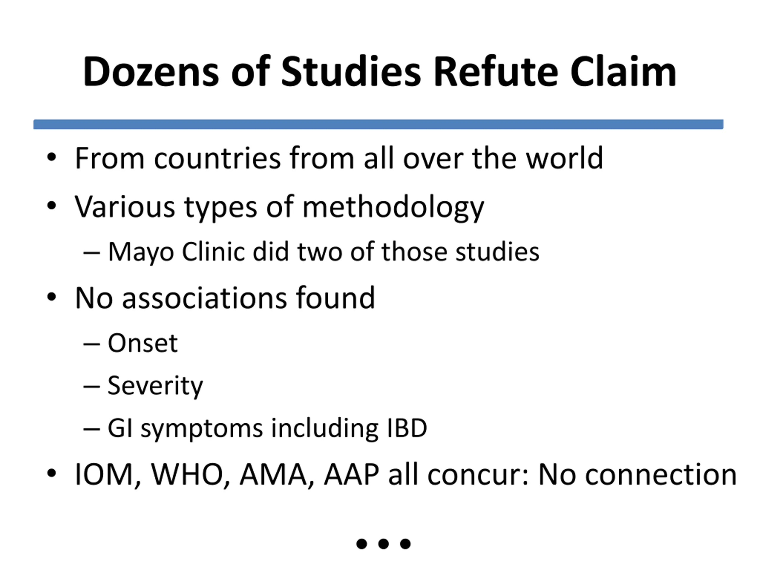Dozens of Studies Refute Claim From countries from all over the world Various types of methodology Mayo Clinic did two of those studies No associations found Onset Severity GI symptoms including IBD IOM, WHO, AMA, AAP all concur: No connection