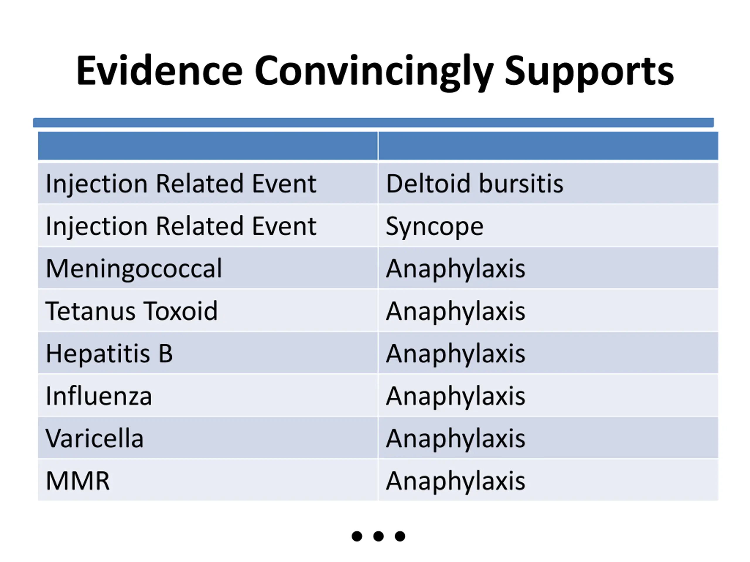 Evidence Convincingly Supports Injection Related Event Injection Related Event Meningococcal Tetanus Toxoid Hepatitis B Influenza Varicella MMR Deltoid bursitis Syncope Anaphylaxis Anaphylaxis Anaphylaxis Anaphylaxis Anaphylaxis Anaphylaxis