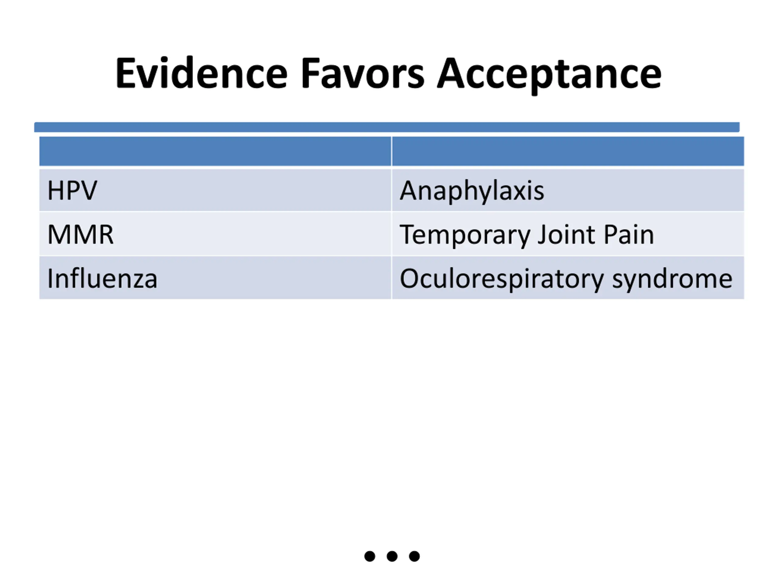 Evidence Favors Acceptance HPV MMR Influenza Anaphylaxis Temporary Joint Pain Oculorespiratory syndrome