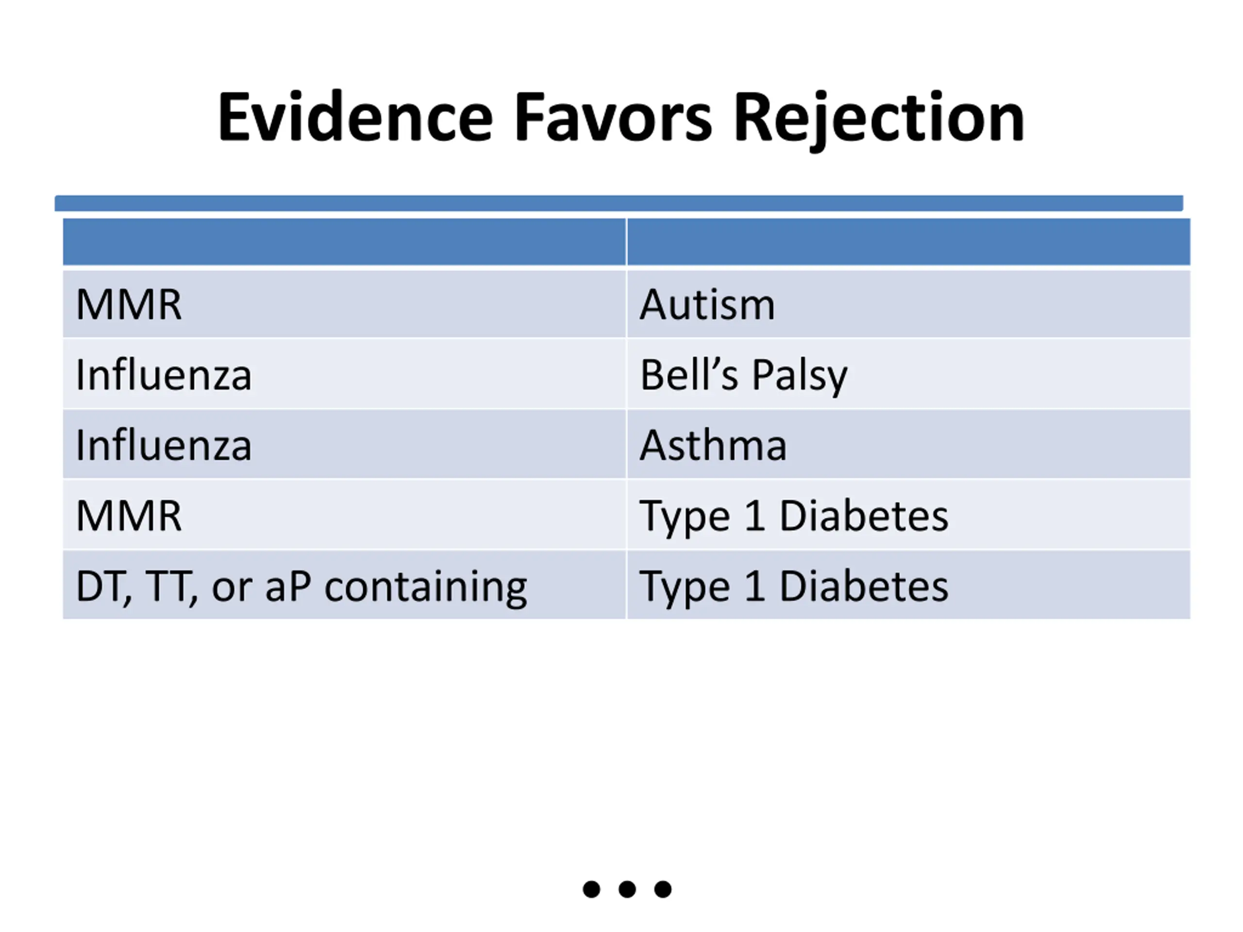 Evidence Favors Rejection MMR Influenza Influenza MMR DT, TT, or aP containing Autism Bell s Palsy Asthma Type 1 Diabetes Type 1 Diabetes