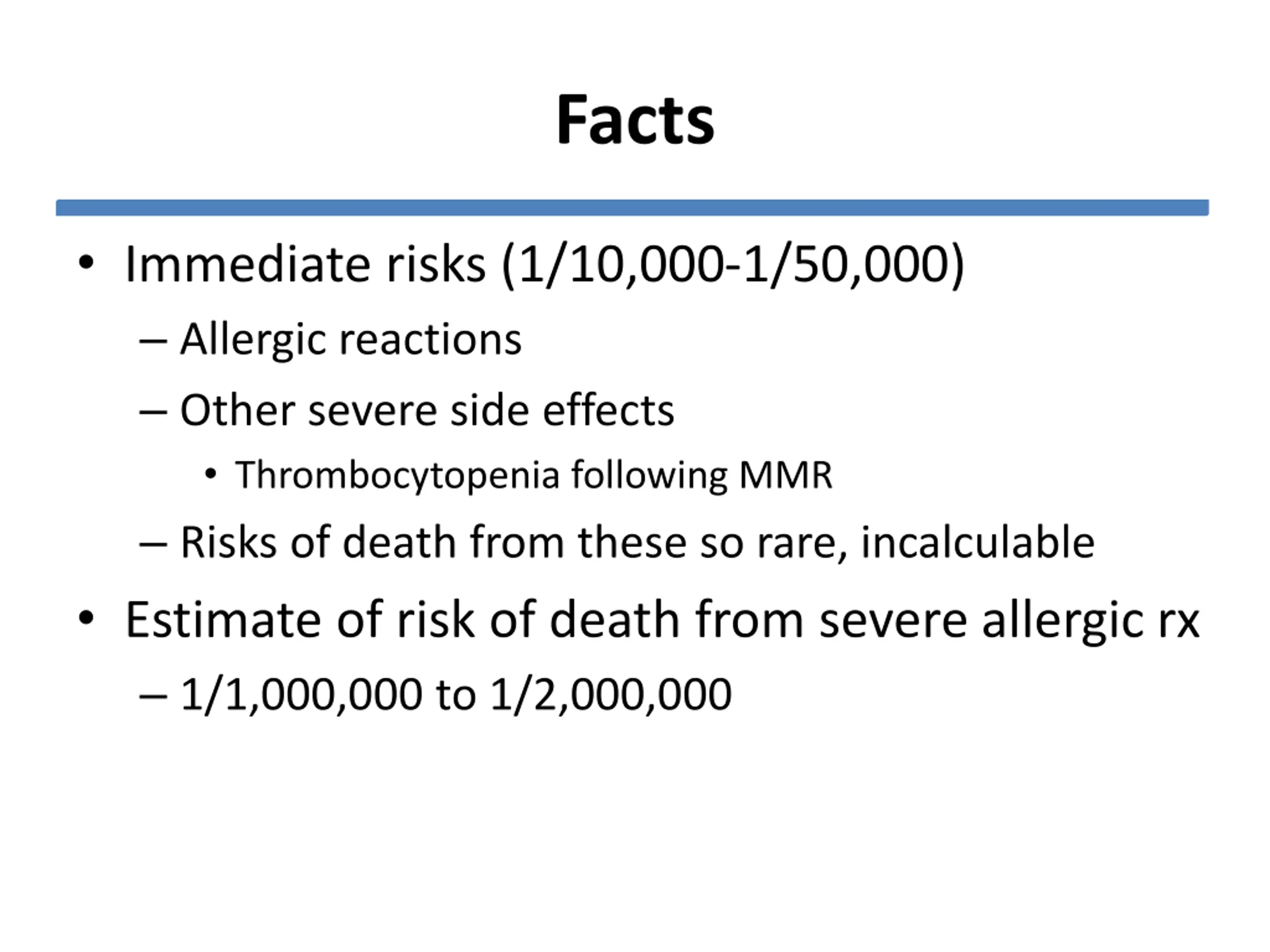 Facts Immediate risks (1/10,000-1/50,000) Allergic reactions Other severe side effects Thrombocytopenia following MMR Risks of death from these so rare, incalculable Estimate of risk of death from severe allergic rx 1/1,000,000 to 1/2,000,000