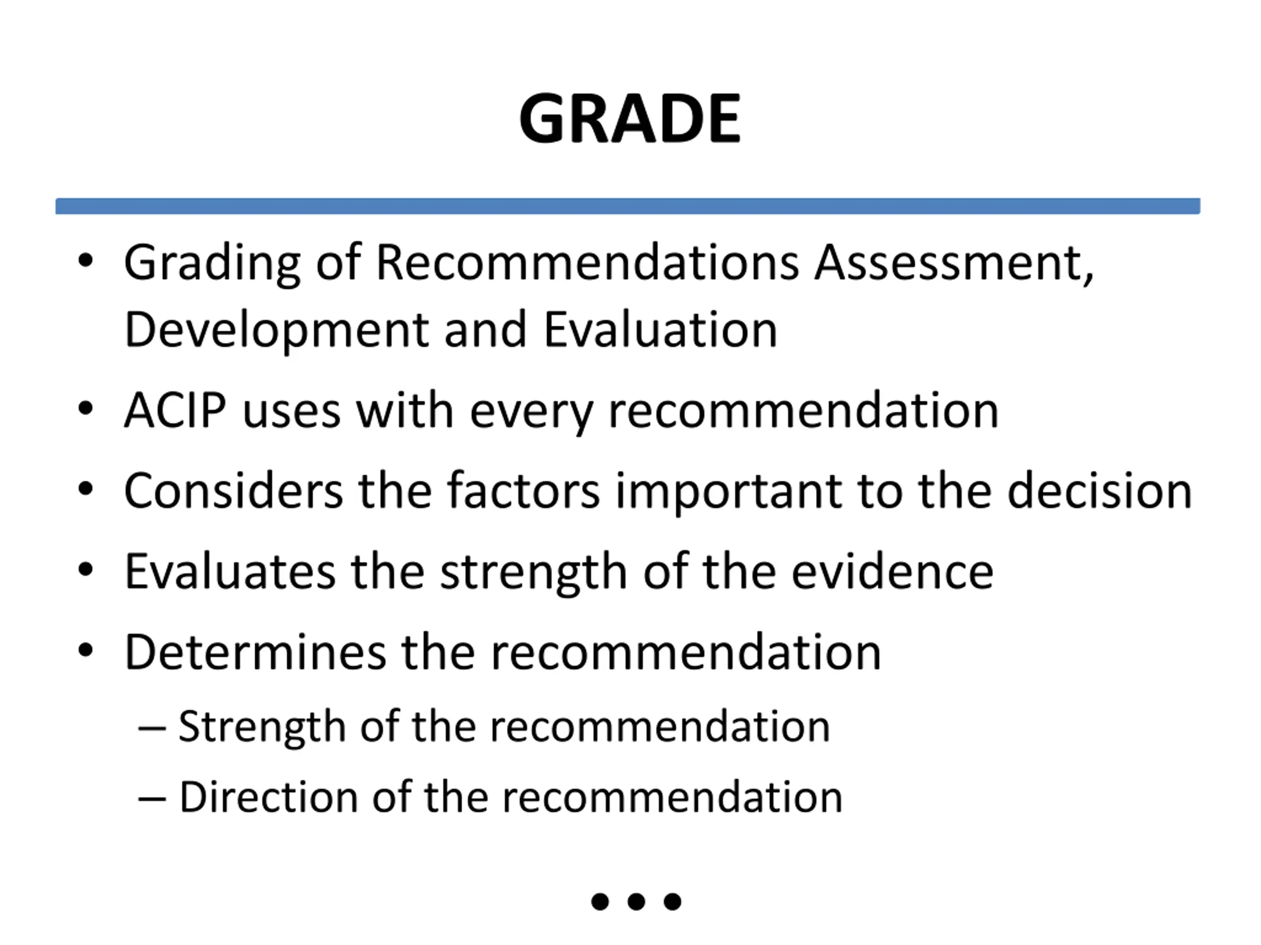 GRADE Grading of Recommendations Assessment, Development and Evaluation ACIP uses with every recommendation Considers the factors important to the decision Evaluates the strength of the evidence Determines the recommendation Strength of the recommendation Direction of the recommendation