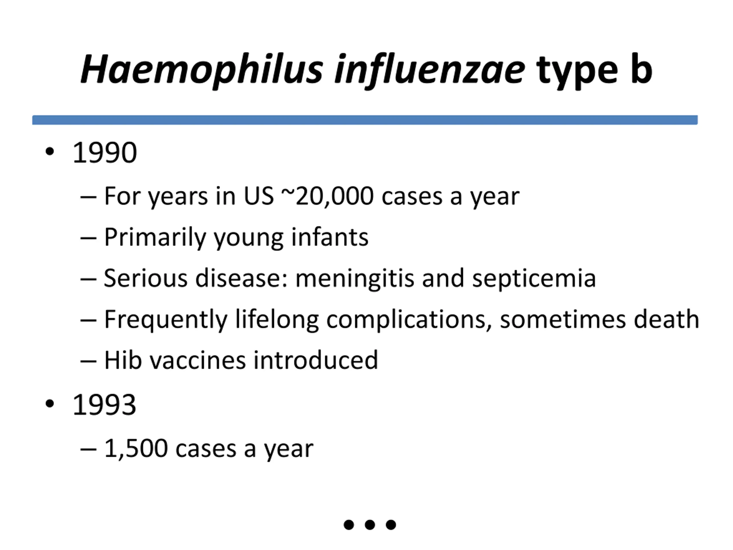 Haemophilus influenzae type b 1990 For years in US ~20,000 cases a year Primarily young infants Serious disease: meningitis and septicemia Frequently lifelong complications, sometimes death Hib vaccines introduced 1993 1,500 cases a year