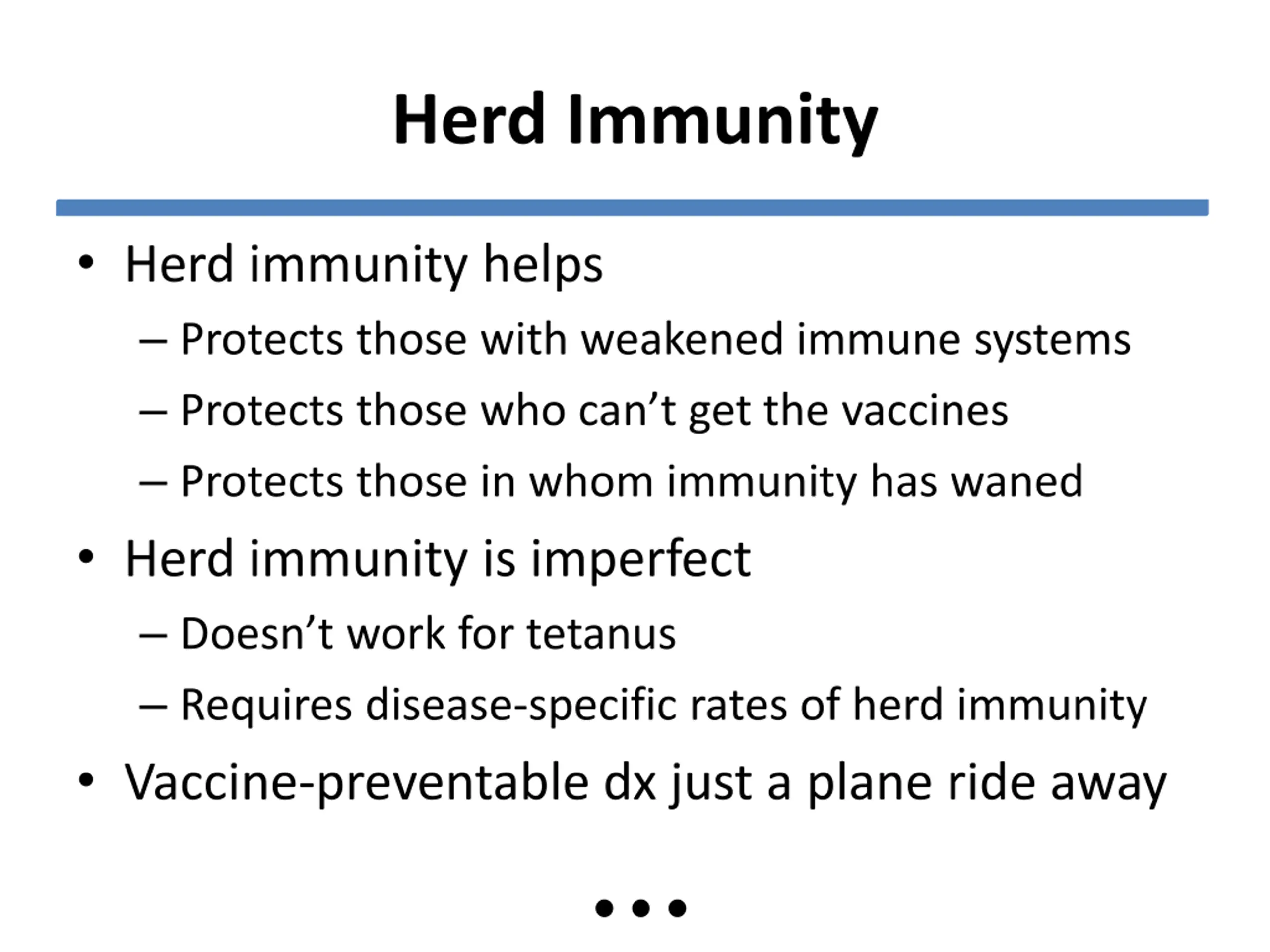 Herd Immunity Herd immunity helps Protects those with weakened immune systems Protects those who can t get the vaccines Protects those in whom immunity has waned Herd immunity is imperfect Doesn t work for tetanus Requires disease-specific rates of herd immunity Vaccine-preventable dx just a plane ride away