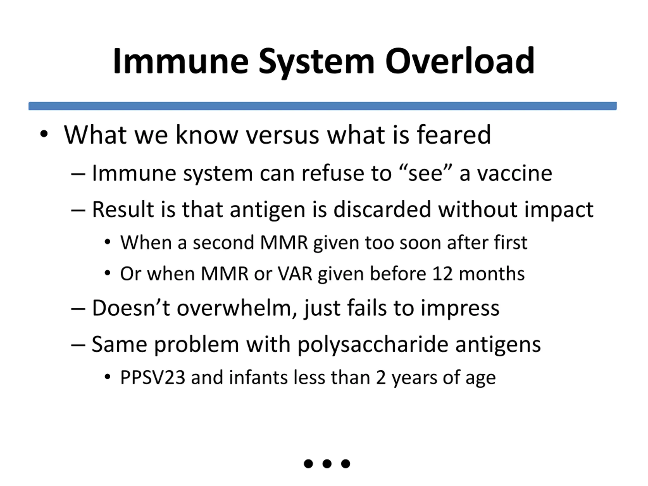 Immune System Overload What we know versus what is feared Immune system can refuse to see a vaccine Result is that antigen is discarded without impact When a second MMR given too soon after first Or when MMR or VAR given before 12 months Doesn t overwhelm, just fails to impress Same problem with polysaccharide antigens PPSV23 and infants less than 2 years of age