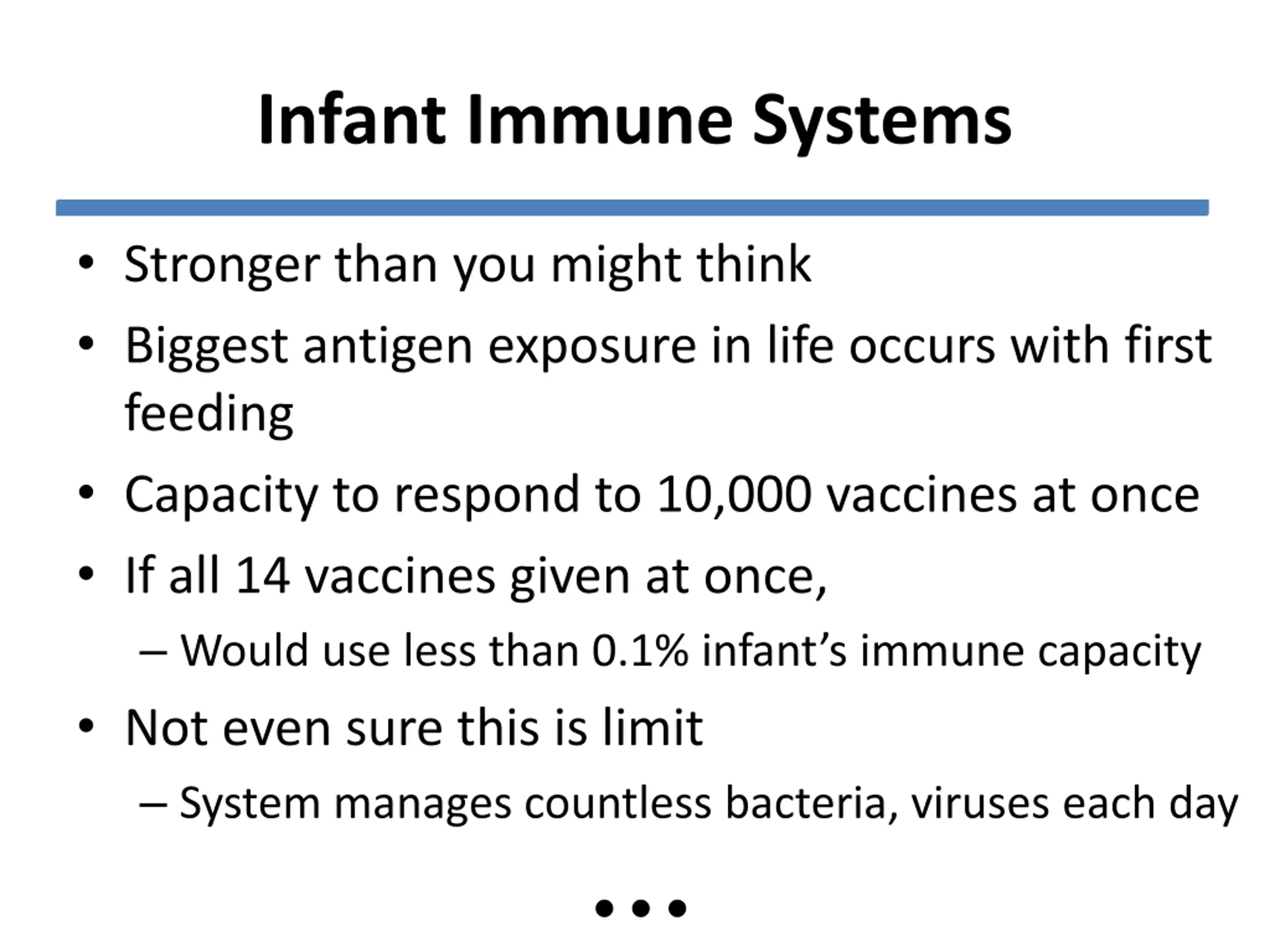 Infant Immune Systems Stronger than you might think Biggest antigen exposure in life occurs with first feeding Capacity to respond to 10,000 vaccines at once If all 14 vaccines given at once, Would use less than 0.1% infant s immune capacity Not even sure this is limit System manages countless bacteria, viruses each day