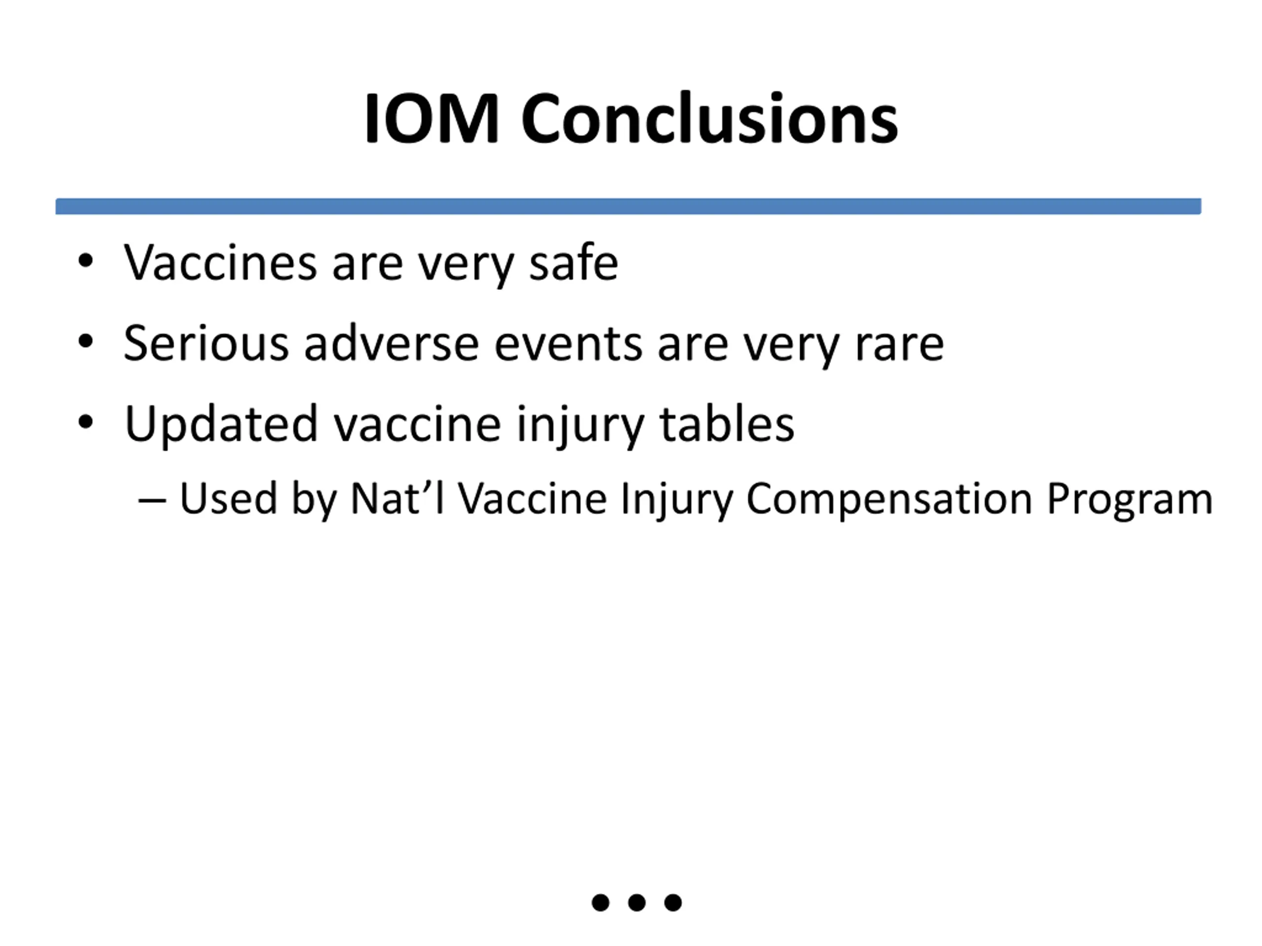 IOM Conclusions Vaccines are very safe Serious adverse events are very rare Updated vaccine injury tables Used by Nat l Vaccine Injury Compensation Program