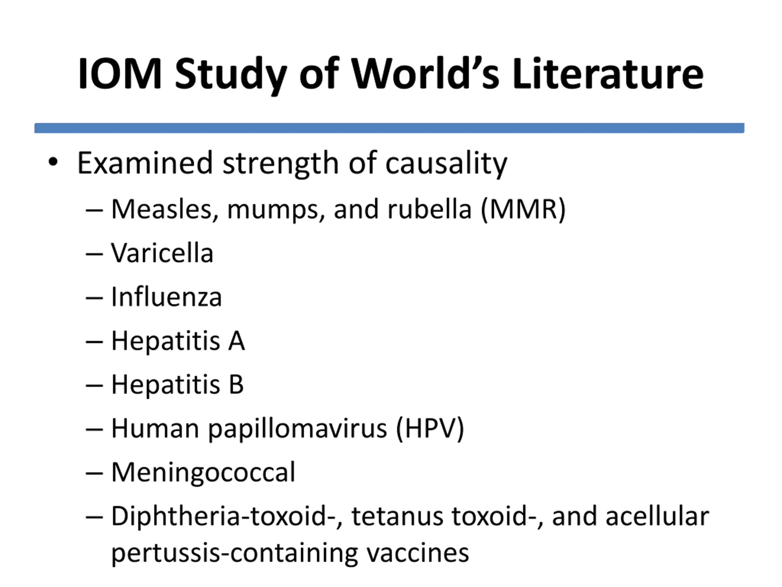 IOM Study of Worlds Literature Examined strength of causality Measles, mumps, and rubella (MMR) Varicella Influenza Hepatitis A Hepatitis B Human papillomavirus (HPV) Meningococcal Diphtheria-toxoid-, tetanus toxoid-, and acellular pertussis-containing vaccines