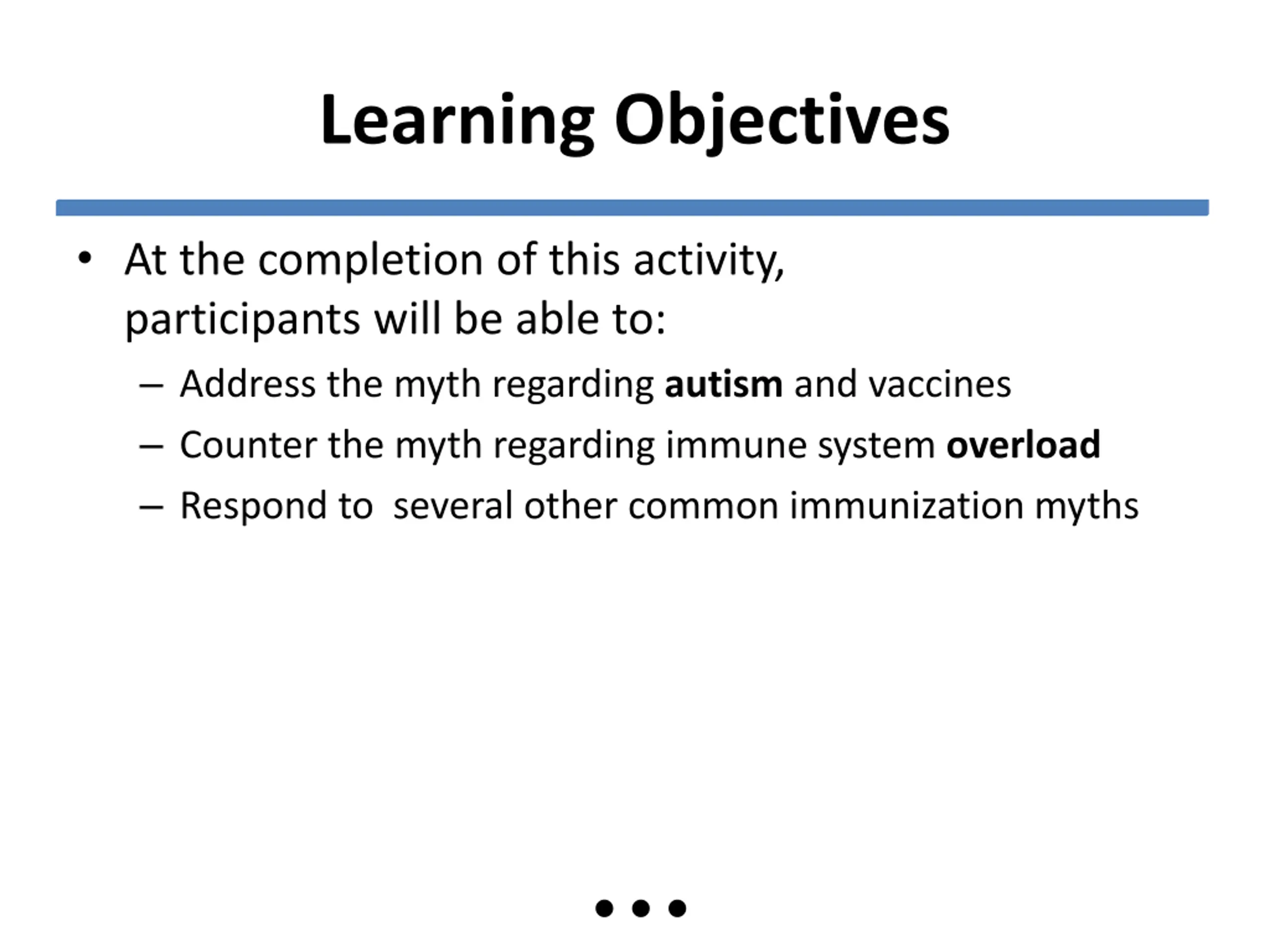 Learning Objectives At the completion of this activity, participants will be able to: Address the myth regarding autism and vaccines Counter the myth regarding immune system overload Respond to several other common immunization myths