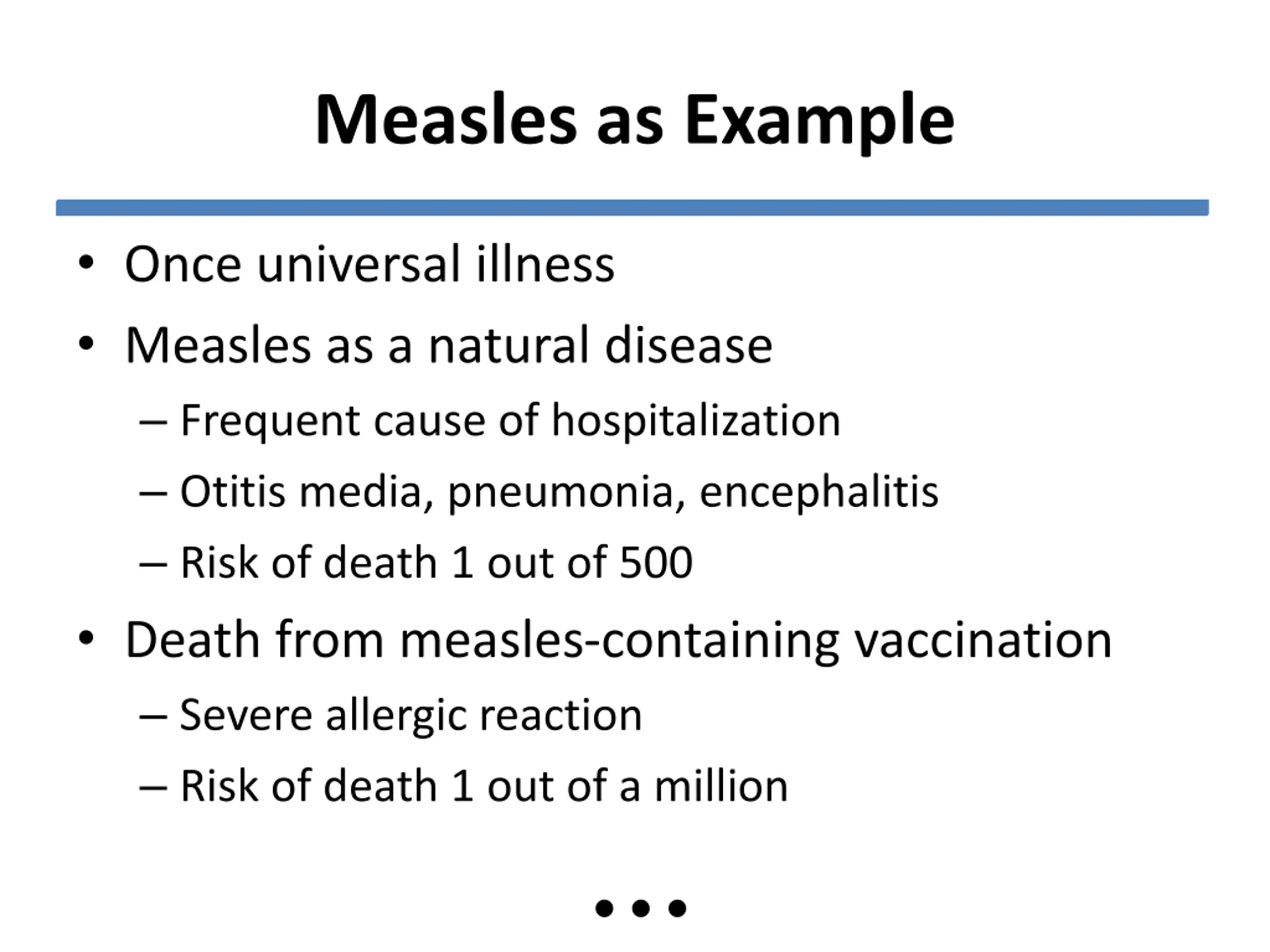 Measles as Example Once universal illness Measles as a natural disease Frequent cause of hospitalization Otitis media, pneumonia, encephalitis Risk of death 1 out of 500 Death from measles-containing vaccination Severe allergic reaction Risk of death 1 out of a million