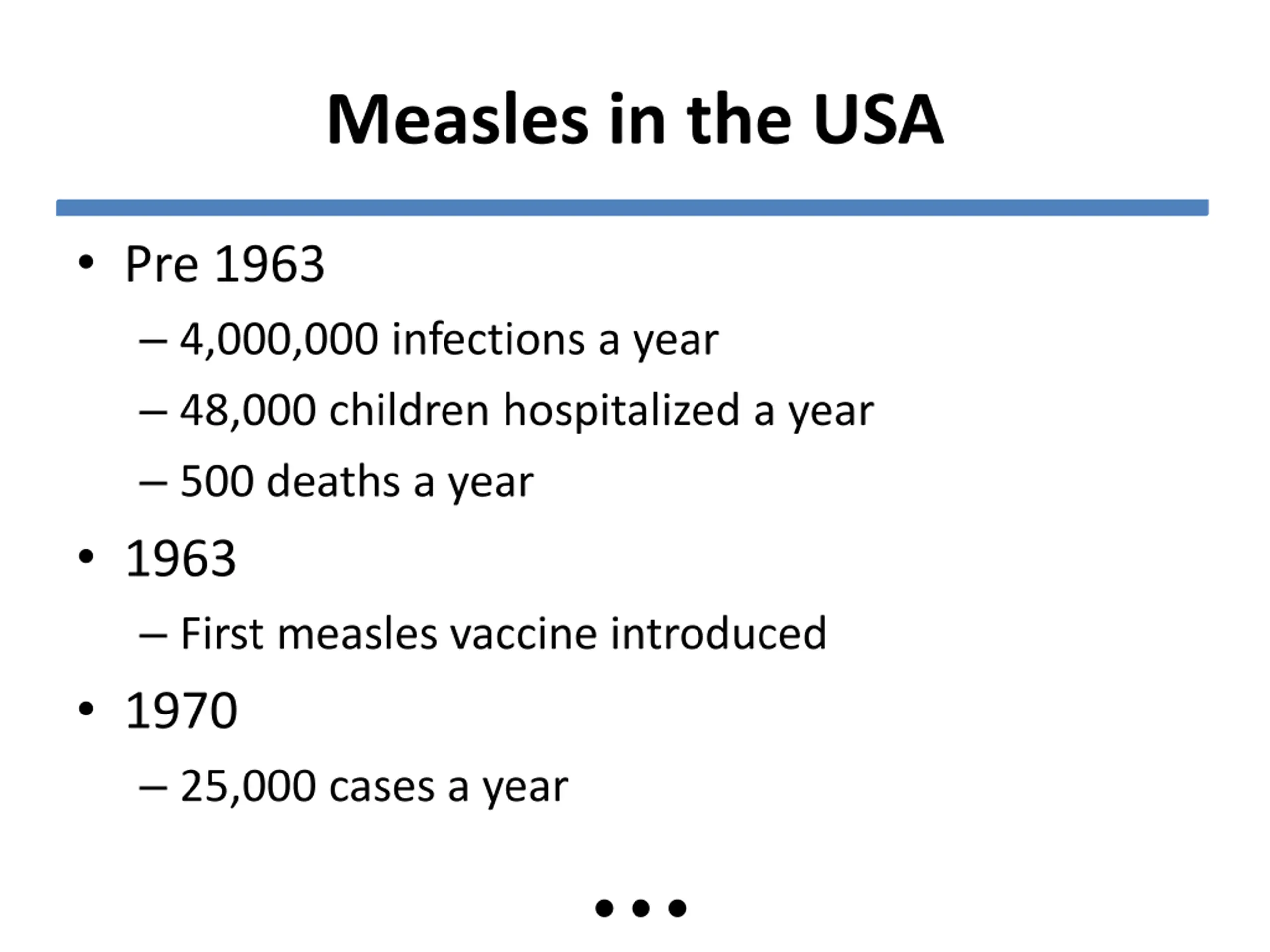 Measles in the USA Pre 1963 4,000,000 infections a year 48,000 children hospitalized a year 500 deaths a year 1963 First measles vaccine introduced 1970 25,000 cases a year