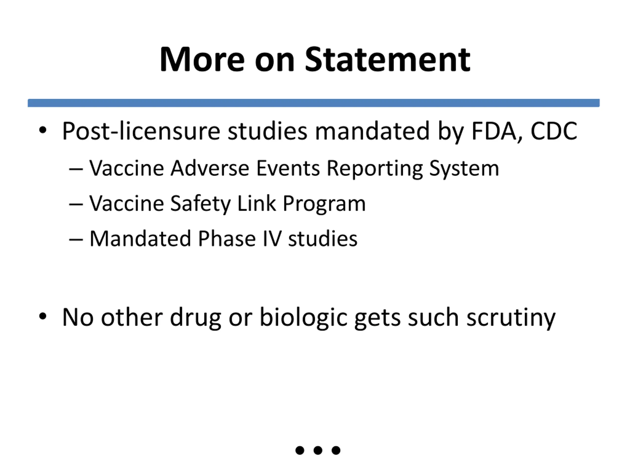 More on Statement Post-licensure studies mandated by FDA, CDC Vaccine Adverse Events Reporting System Vaccine Safety Link Program Mandated Phase IV studies No other drug or biologic gets such scrutiny