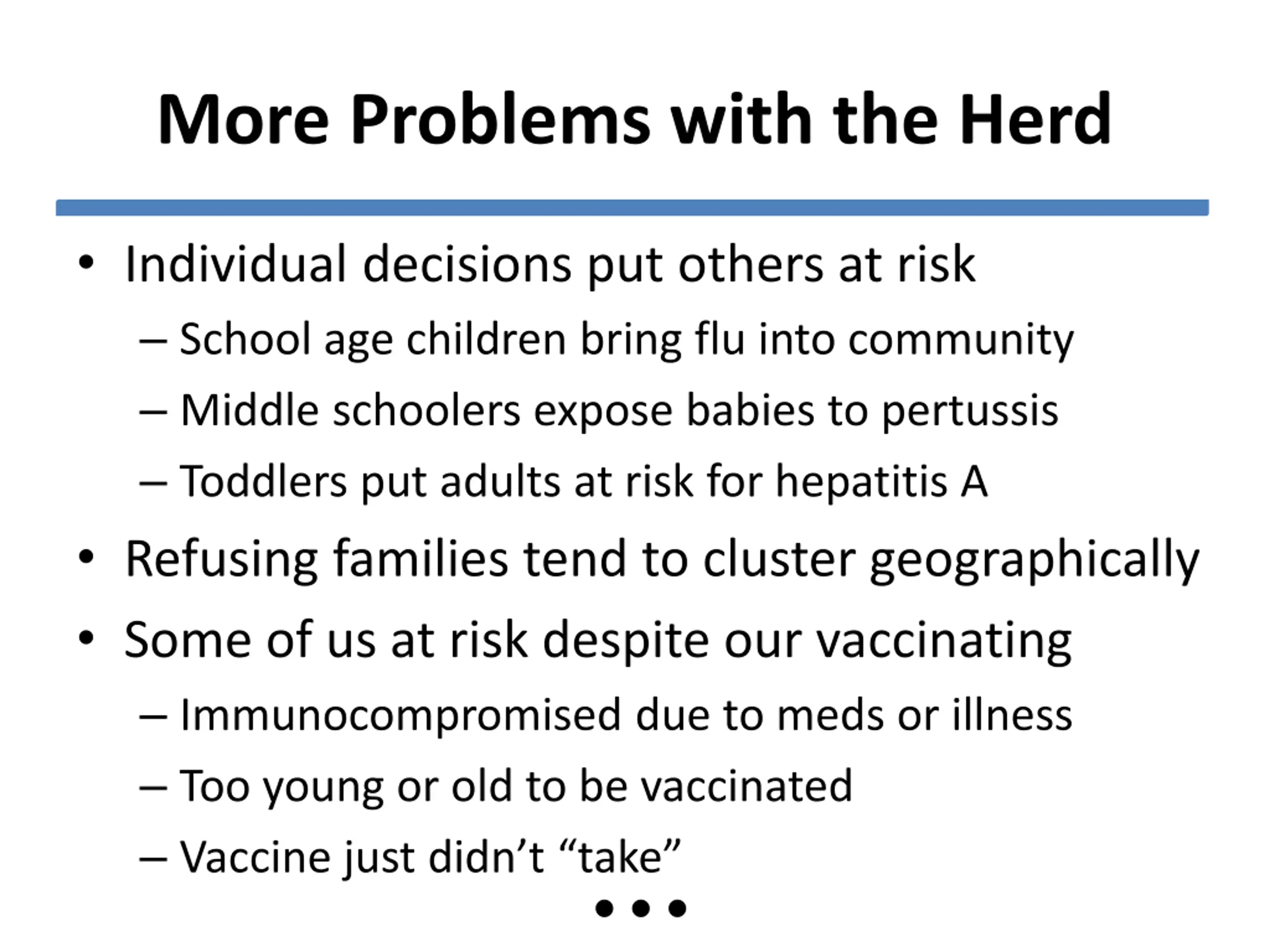 More Problems with the Herd Individual decisions put others at risk School age children bring flu into community Middle schoolers expose babies to pertussis Toddlers put adults at risk for hepatitis A Refusing families tend to cluster geographically Some of us at risk despite our vaccinating Immunocompromised due to meds or illness Too young or old to be vaccinated Vaccine just didn t take
