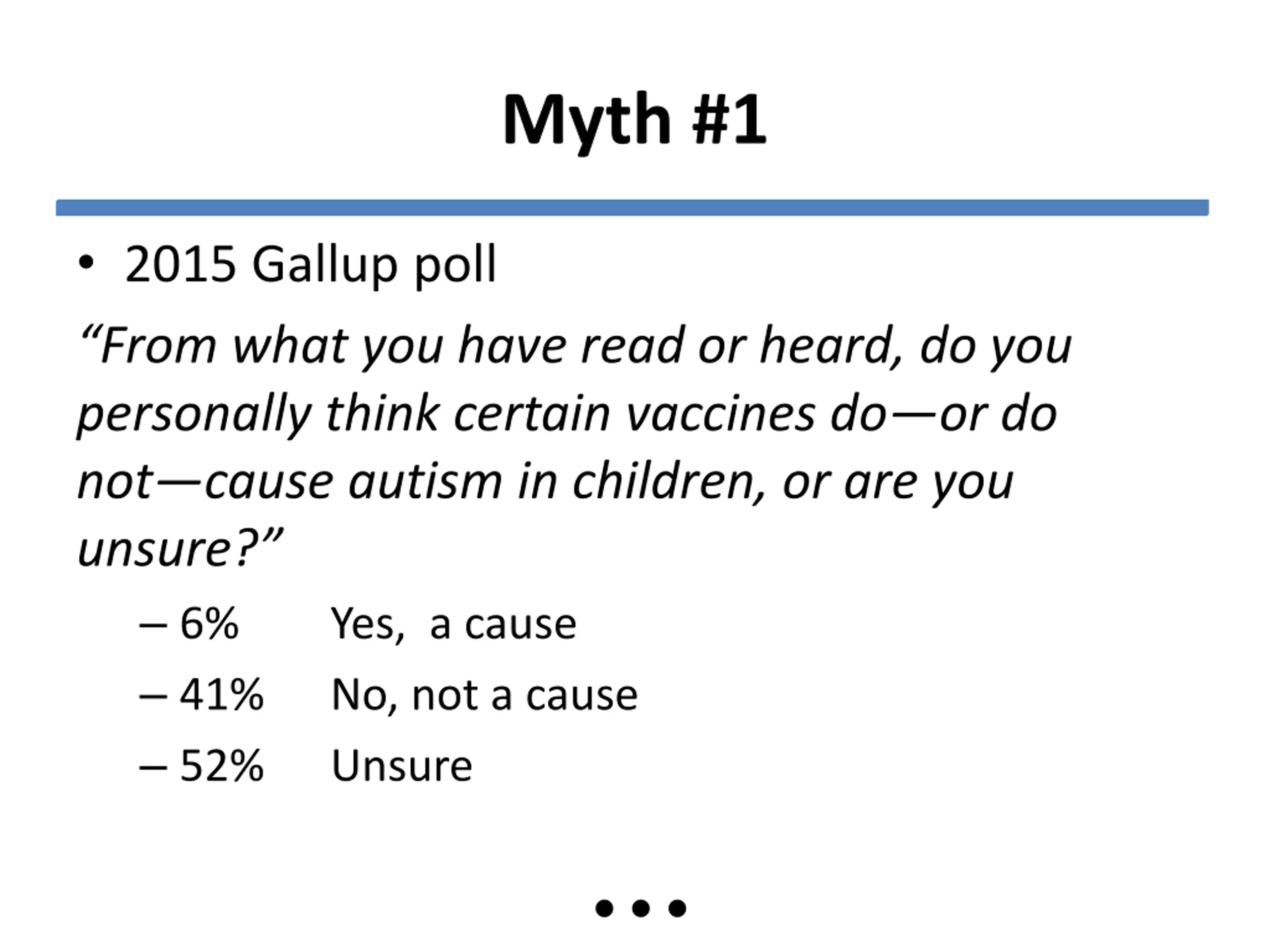 Myth #1 2015 Gallup poll From what you have read or heard, do you personally think certain vaccines do or do not cause autism in children, or are you unsure? 6% Yes, a cause 41% No, not a cause 52% Unsure