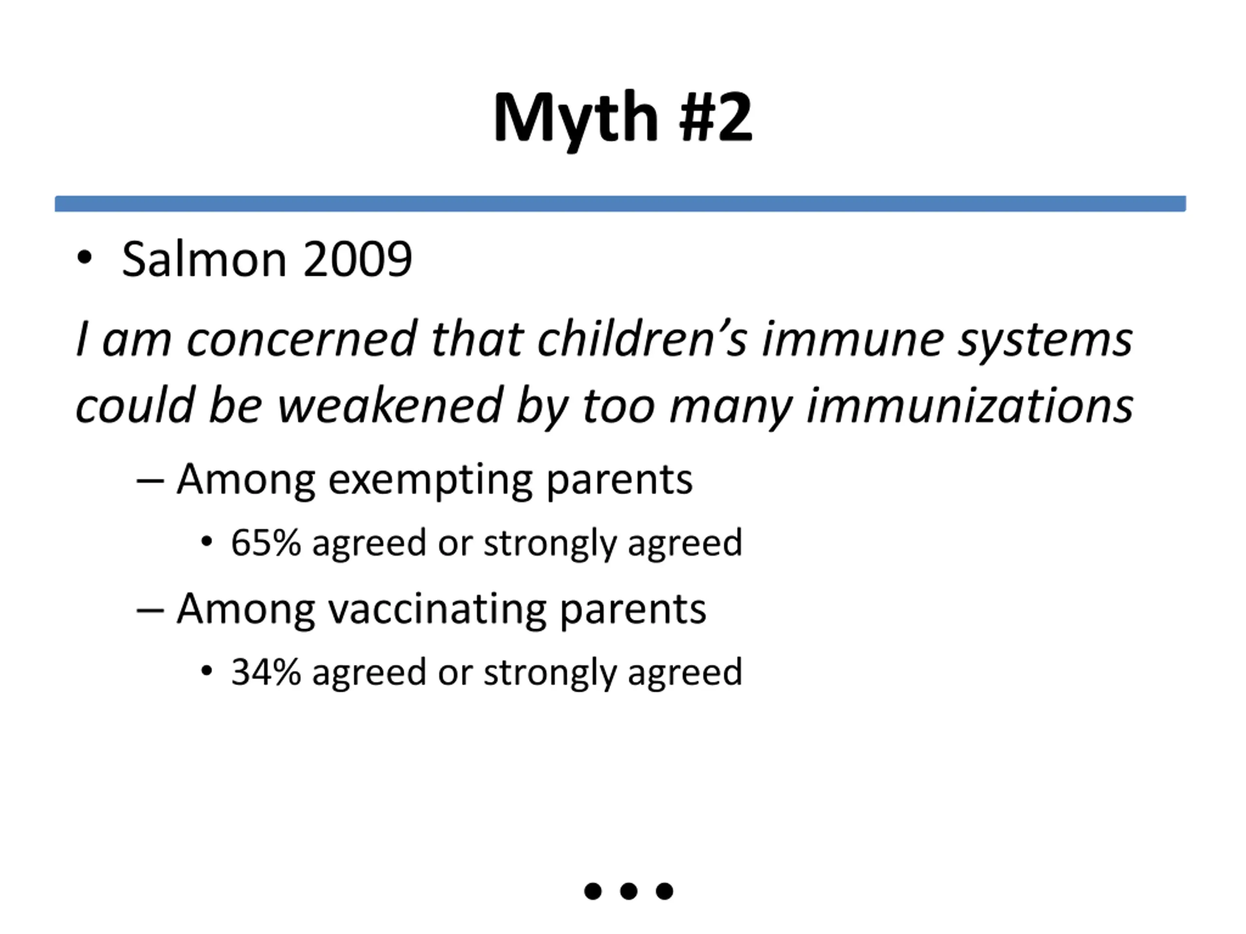 Myth #2 Salmon 2009 I am concerned that children s immune systems could be weakened by too many immunizations Among exempting parents 65% agreed or strongly agreed Among vaccinating parents 34% agreed or strongly agreed