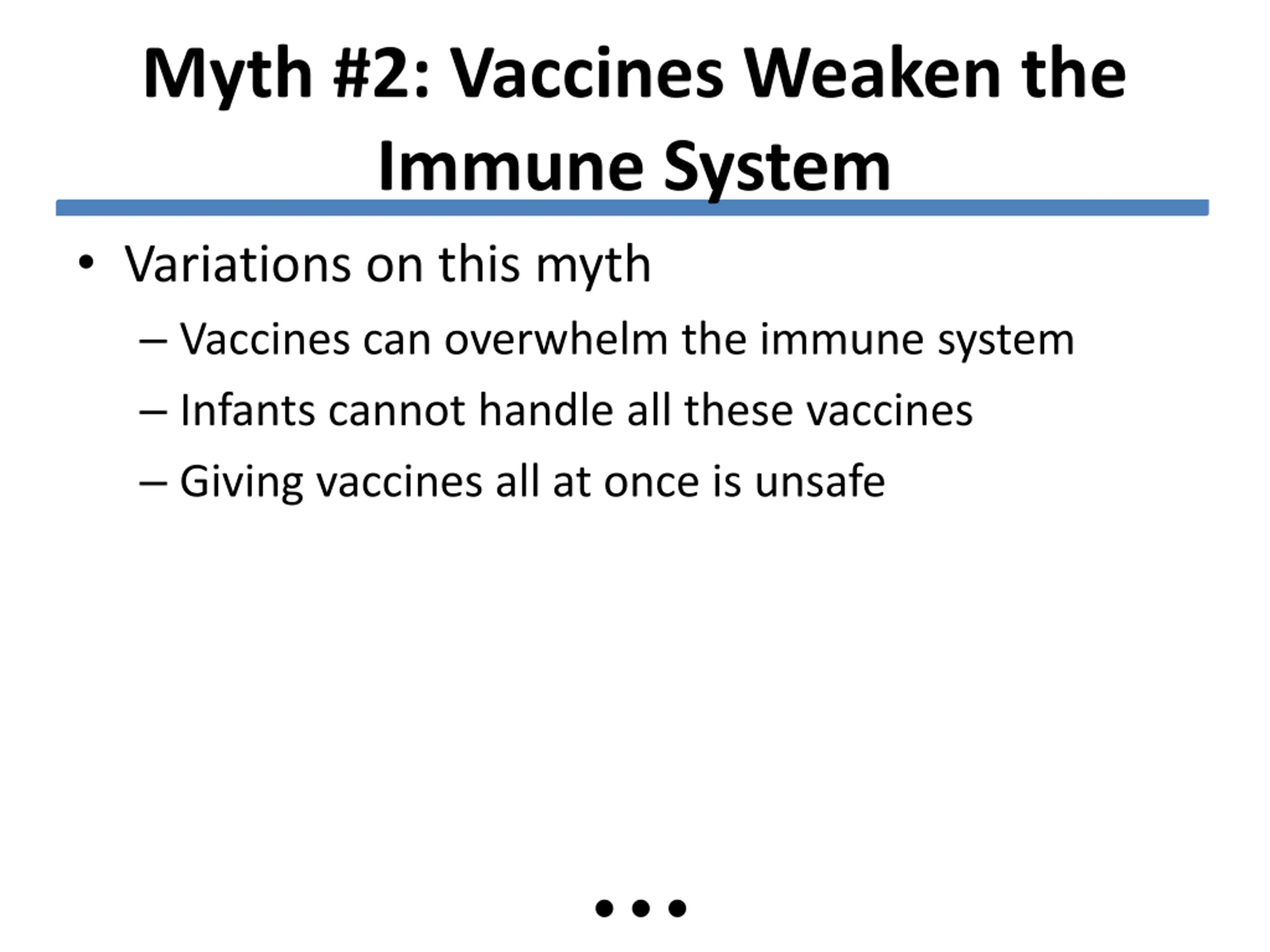 Myth #2: Vaccines Weaken the Immune System Variations on this myth Vaccines can overwhelm the immune system Infants cannot handle all these vaccines Giving vaccines all at once is unsafe
