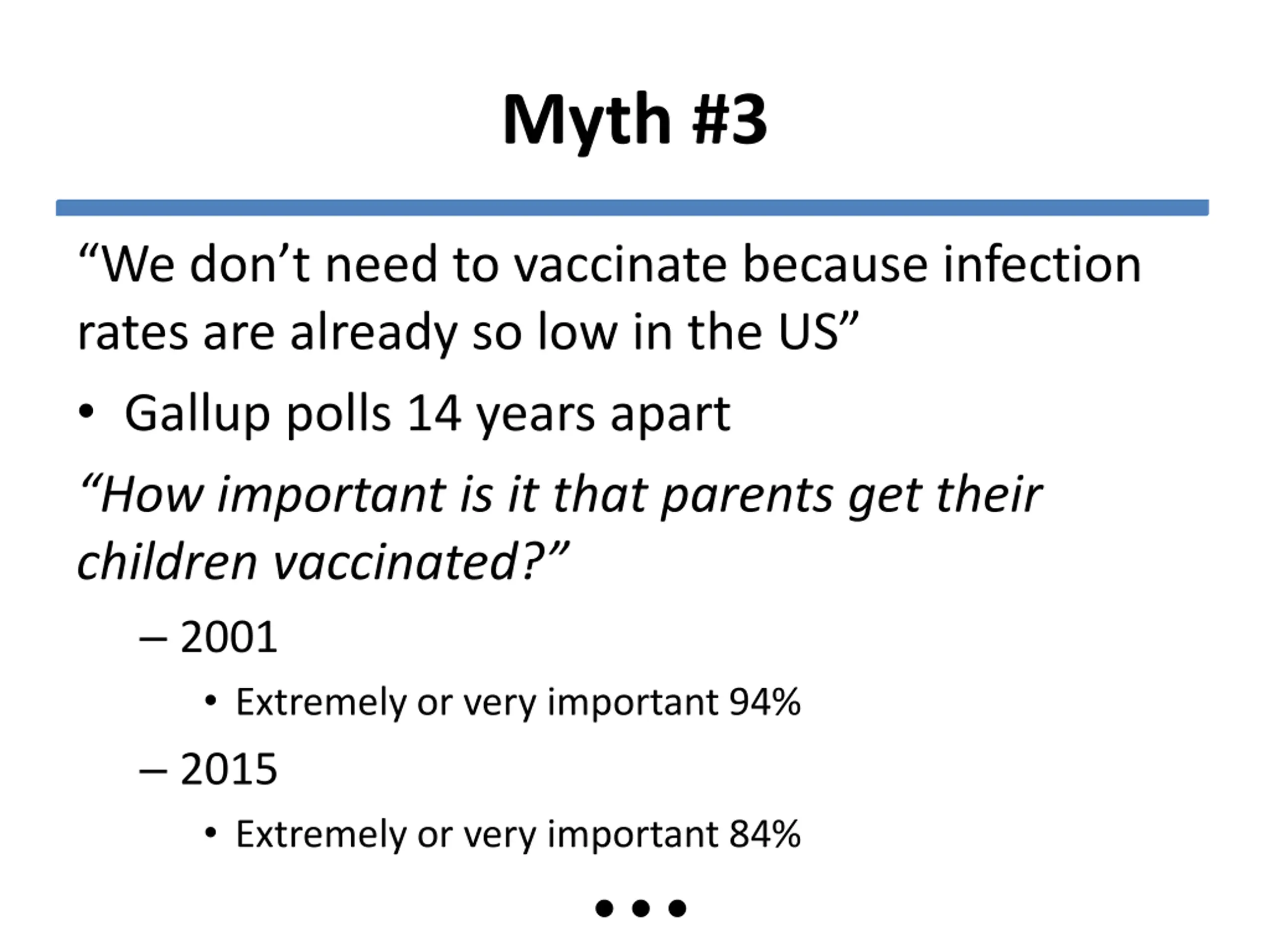 Myth #3 We don t need to vaccinate because infection rates are already so low in the US Gallup polls 14 years apart How important is it that parents get their children vaccinated? 2001 Extremely or very important 94% 2015 Extremely or very important 84%