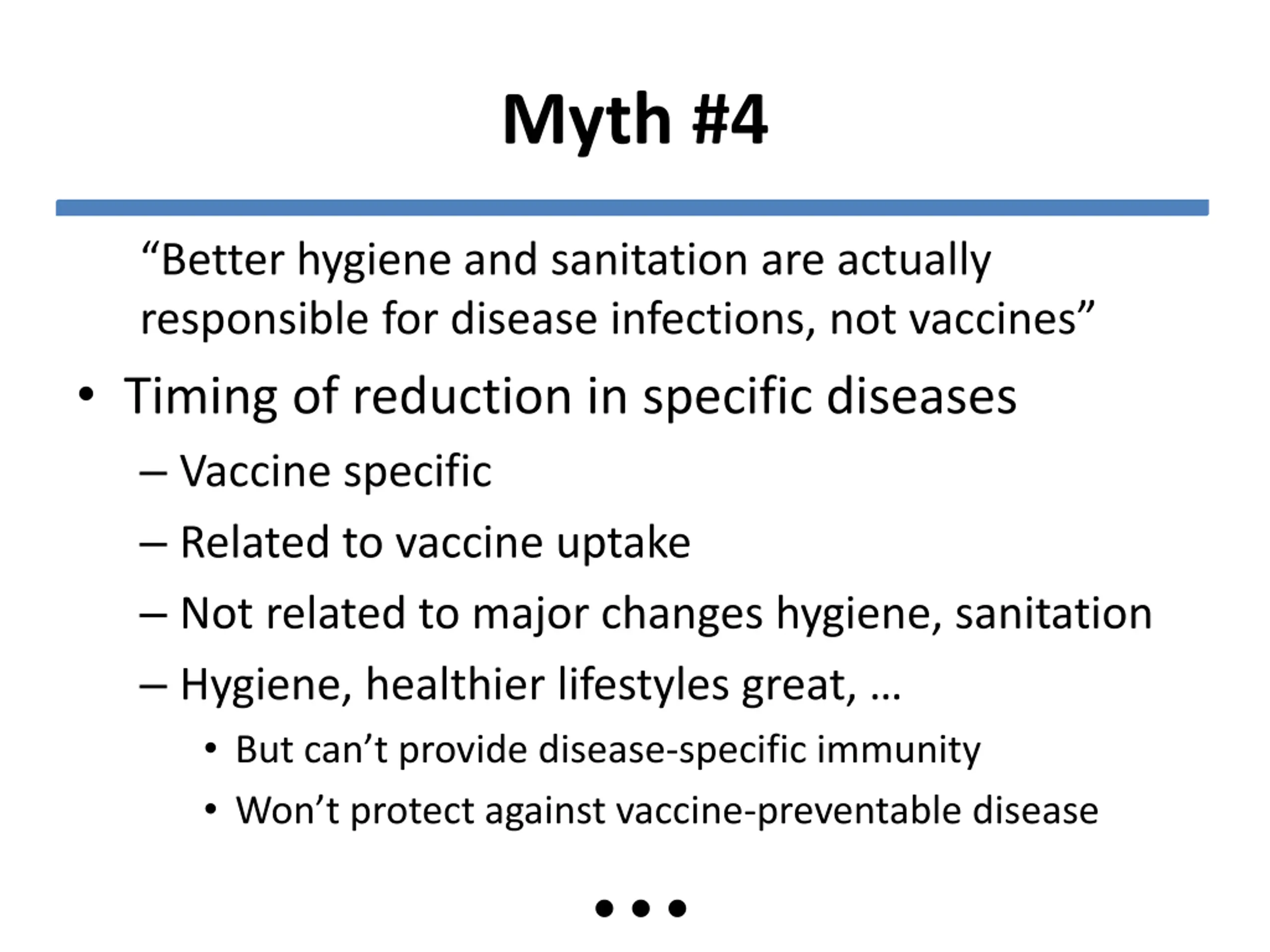 Myth #4 Better hygiene and sanitation are actually responsible for disease infections, not vaccines Timing of reduction in specific diseases Vaccine specific Related to vaccine uptake Not related to major changes hygiene, sanitation Hygiene, healthier lifestyles great, But can t provide disease-specific immunity Won t protect against vaccine-preventable disease