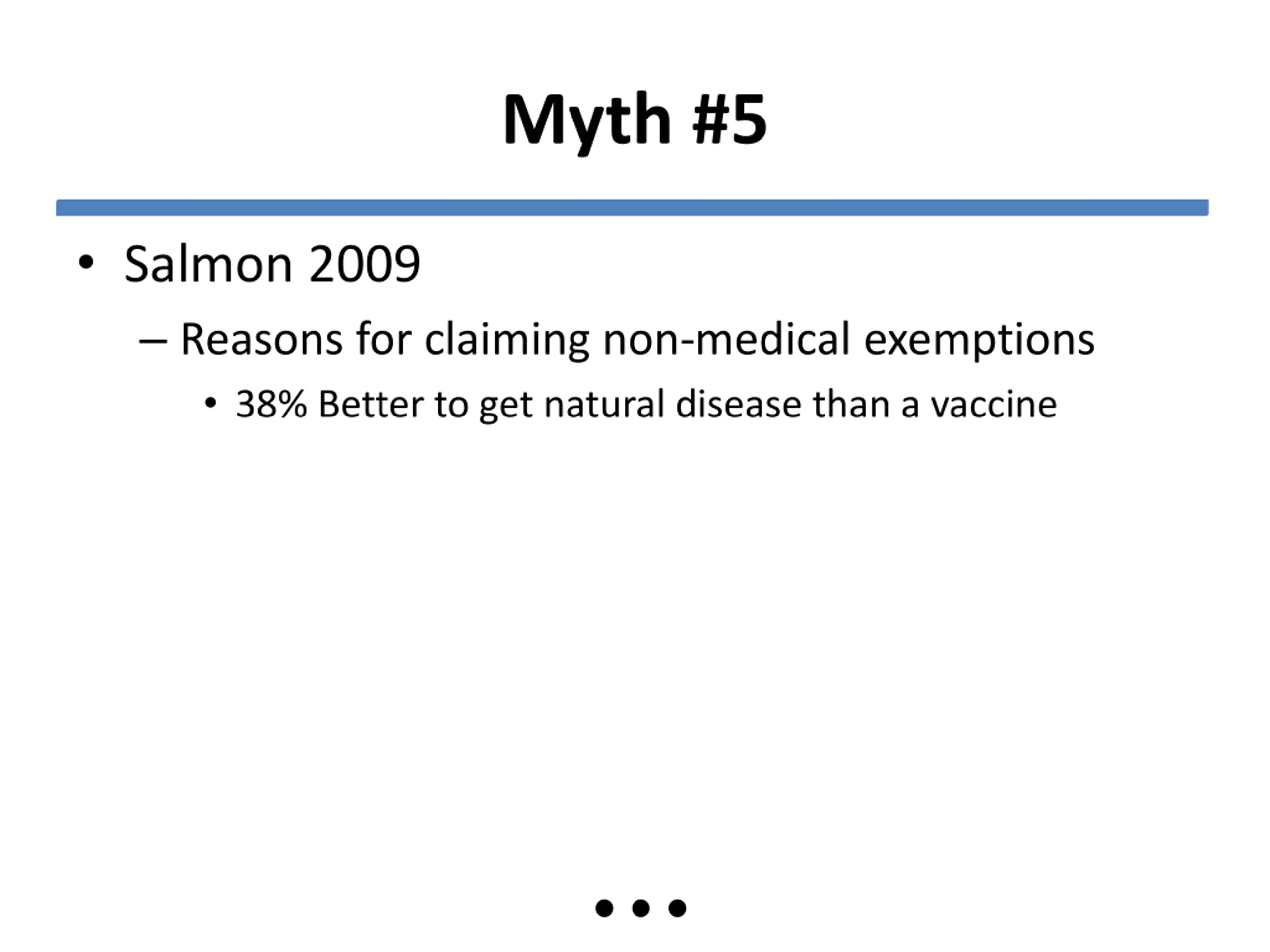 Myth #5 Salmon 2009 Reasons for claiming non-medical exemptions 38% Better to get natural disease than a vaccine