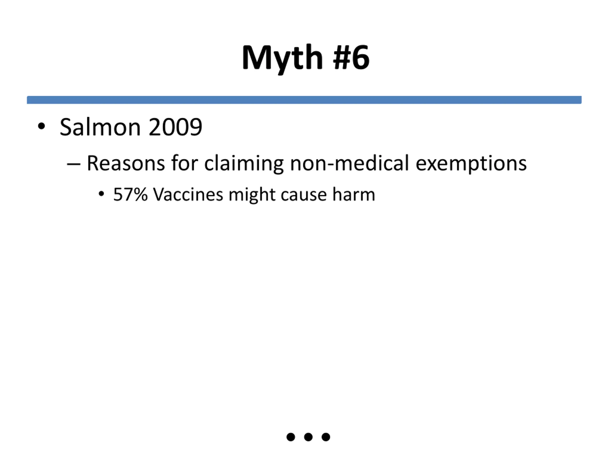 Myth #6 Salmon 2009 Reasons for claiming non-medical exemptions 57% Vaccines might cause harm