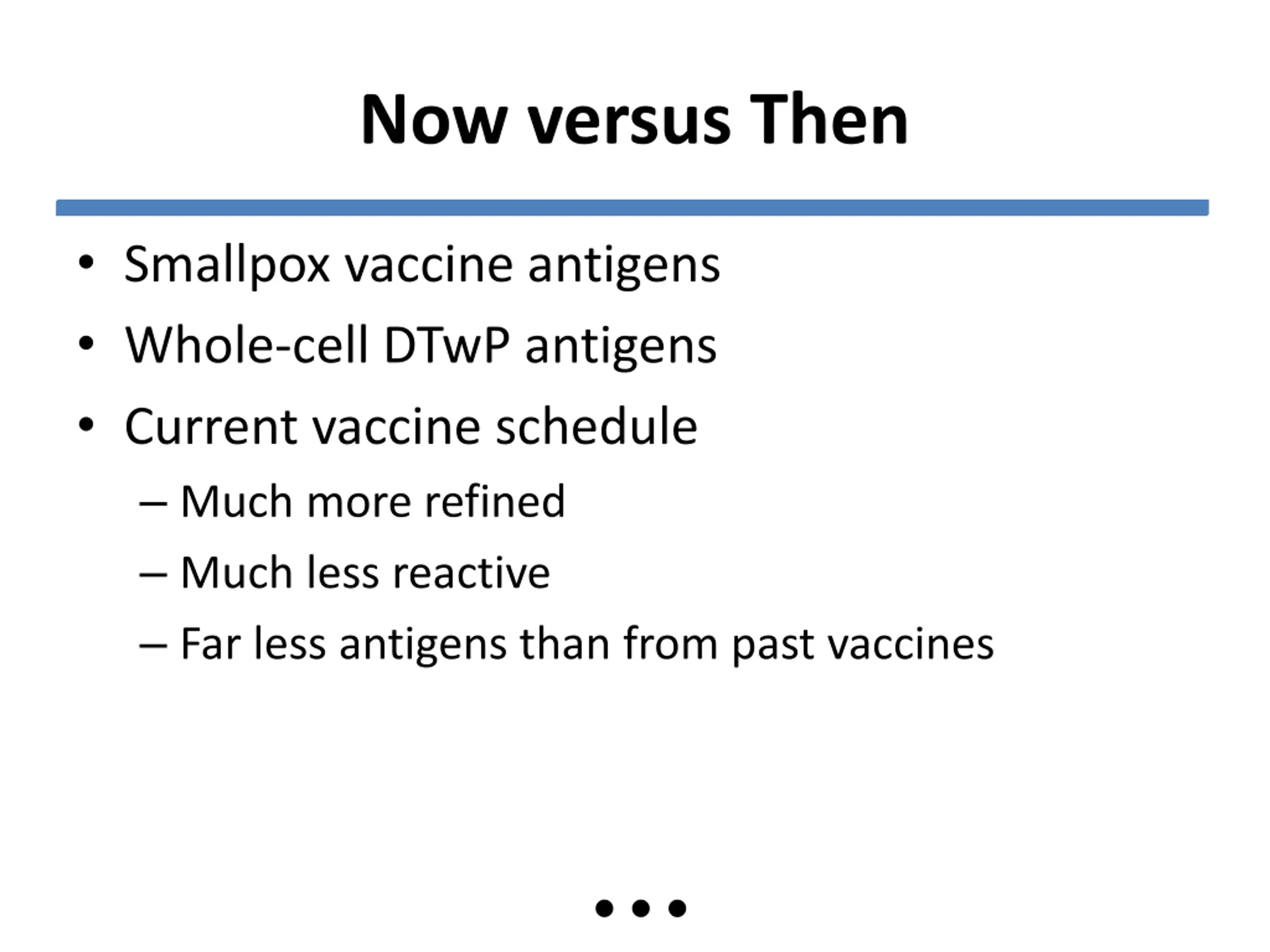 Now versus Then Smallpox vaccine antigens Whole-cell DTwP antigens Current vaccine schedule Much more refined Much less reactive Far less antigens than from past vaccines