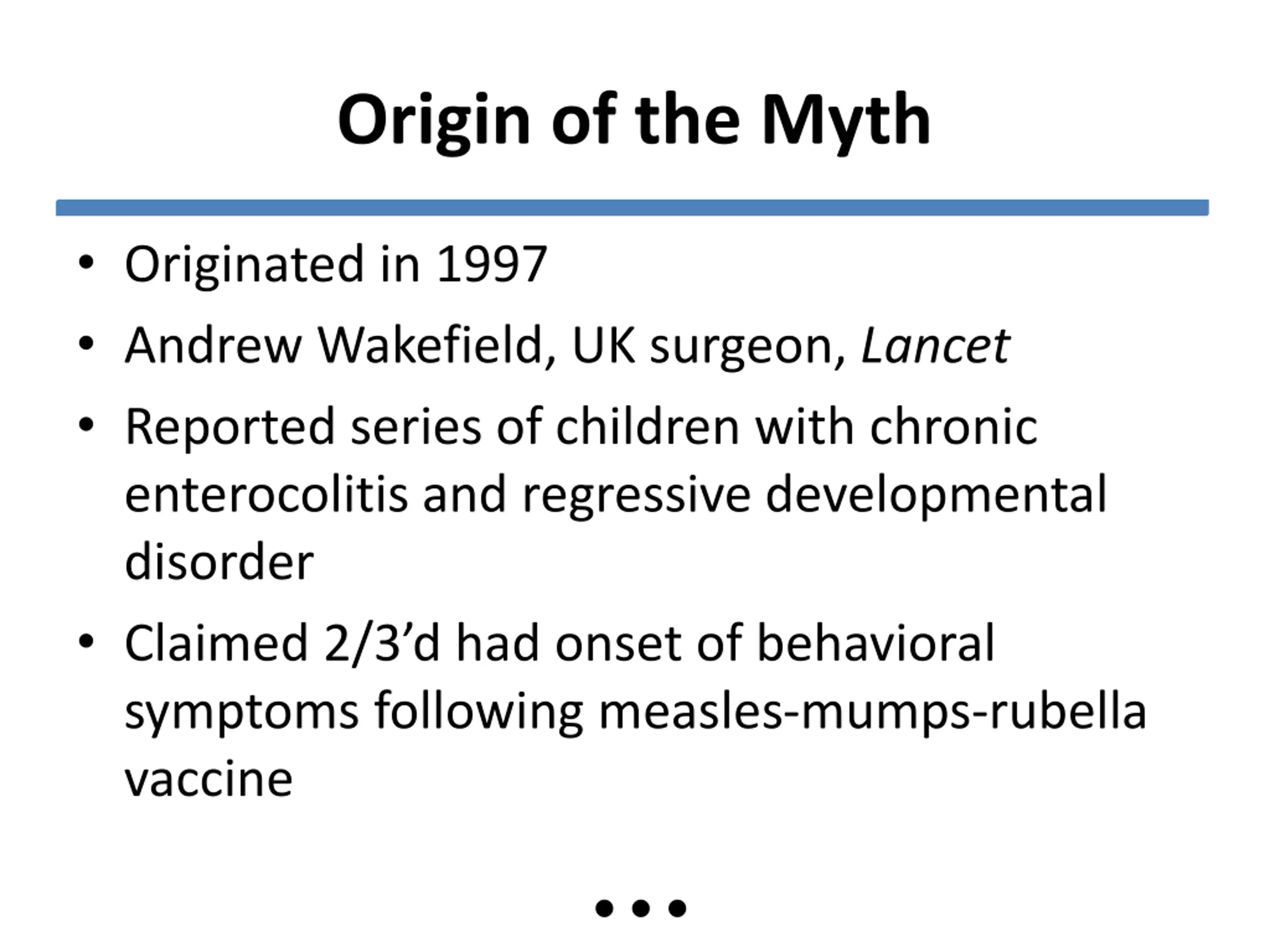 Origin of the Myth Originated in 1997 Andrew Wakefield, UK surgeon, Lancet Reported series of children with chronic enterocolitis and regressive developmental disorder Claimed 2/3 d had onset of behavioral symptoms following measles-mumps-rubella vaccine
