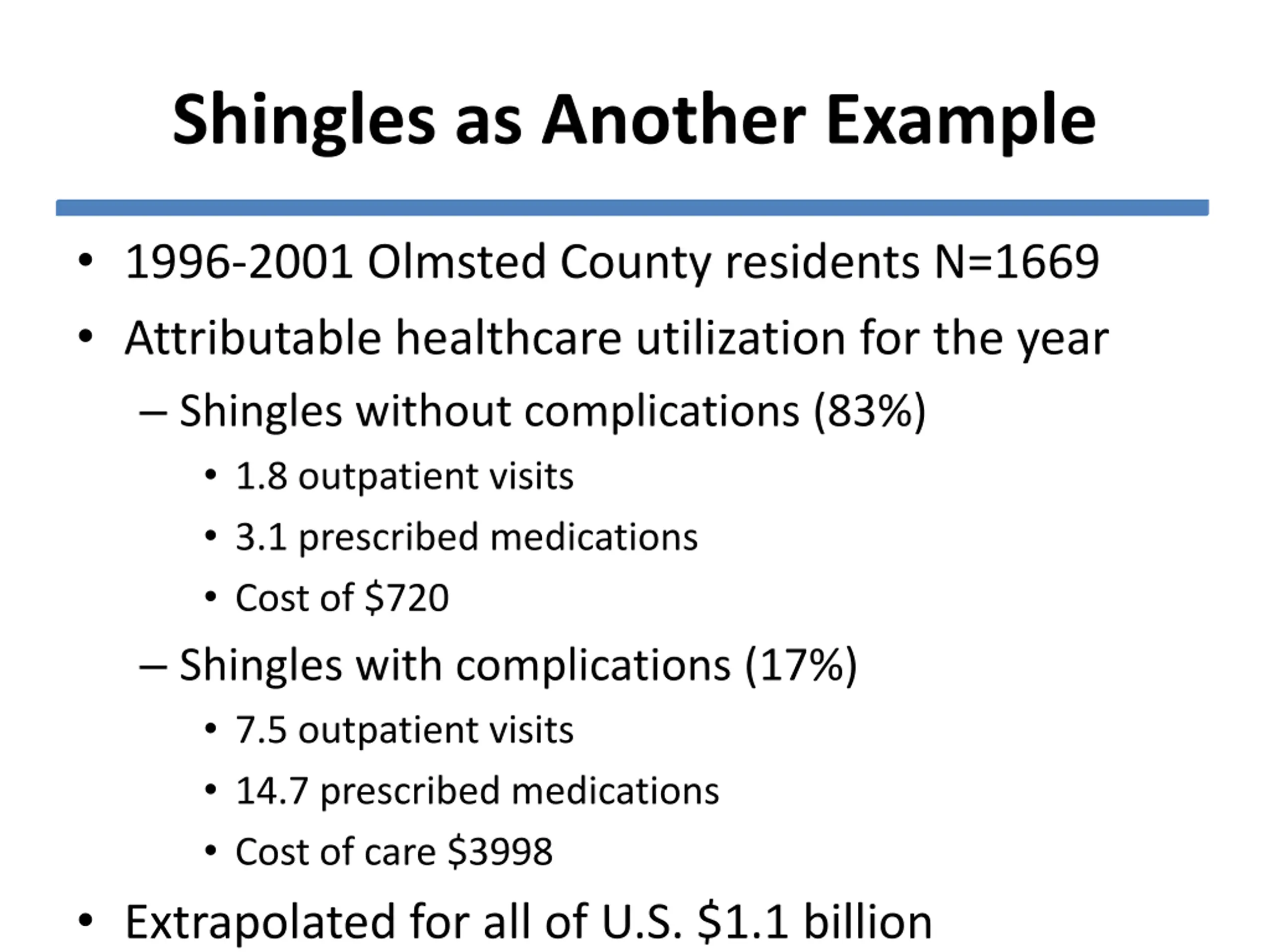 Shingles as Another Example 1996-2001 Olmsted County residents N=1669 Attributable healthcare utilization for the year Shingles without complications (83%) 1.8 outpatient visits 3.1 prescribed medications Cost of $720 Shingles with complications (17%) 7.5 outpatient visits 14.7 prescribed medications Cost of care $3998 Extrapolated for all of U.S. $1.1 billion