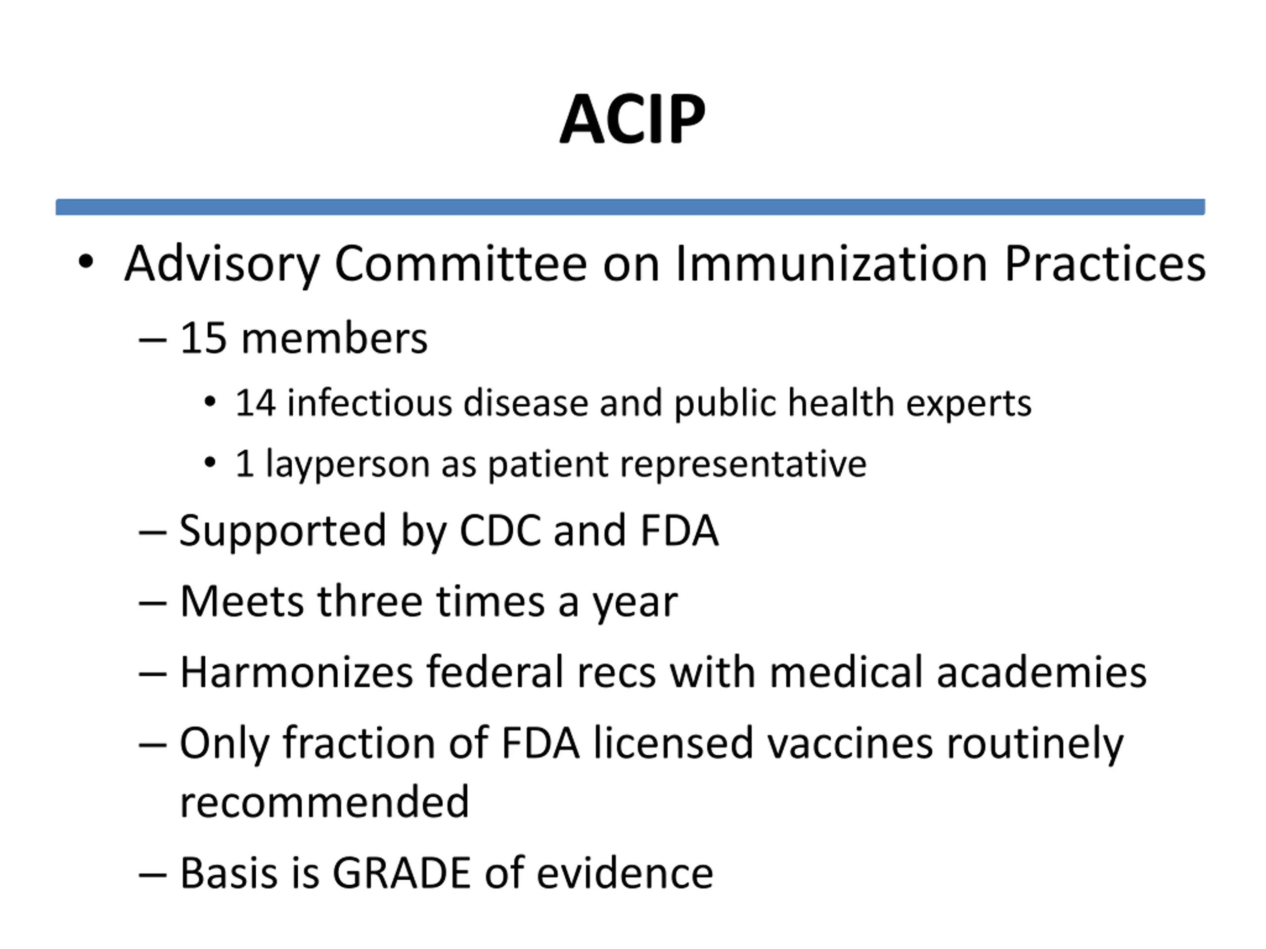 ACIP Advisory Committee on Immunization Practices 15 members 14 infectious disease and public health experts 1 layperson as patient representative Supported by CDC and FDA Meets three times a year Harmonizes federal recs with medical academies Only fraction of FDA licensed vaccines routinely recommended Basis is GRADE of evidence