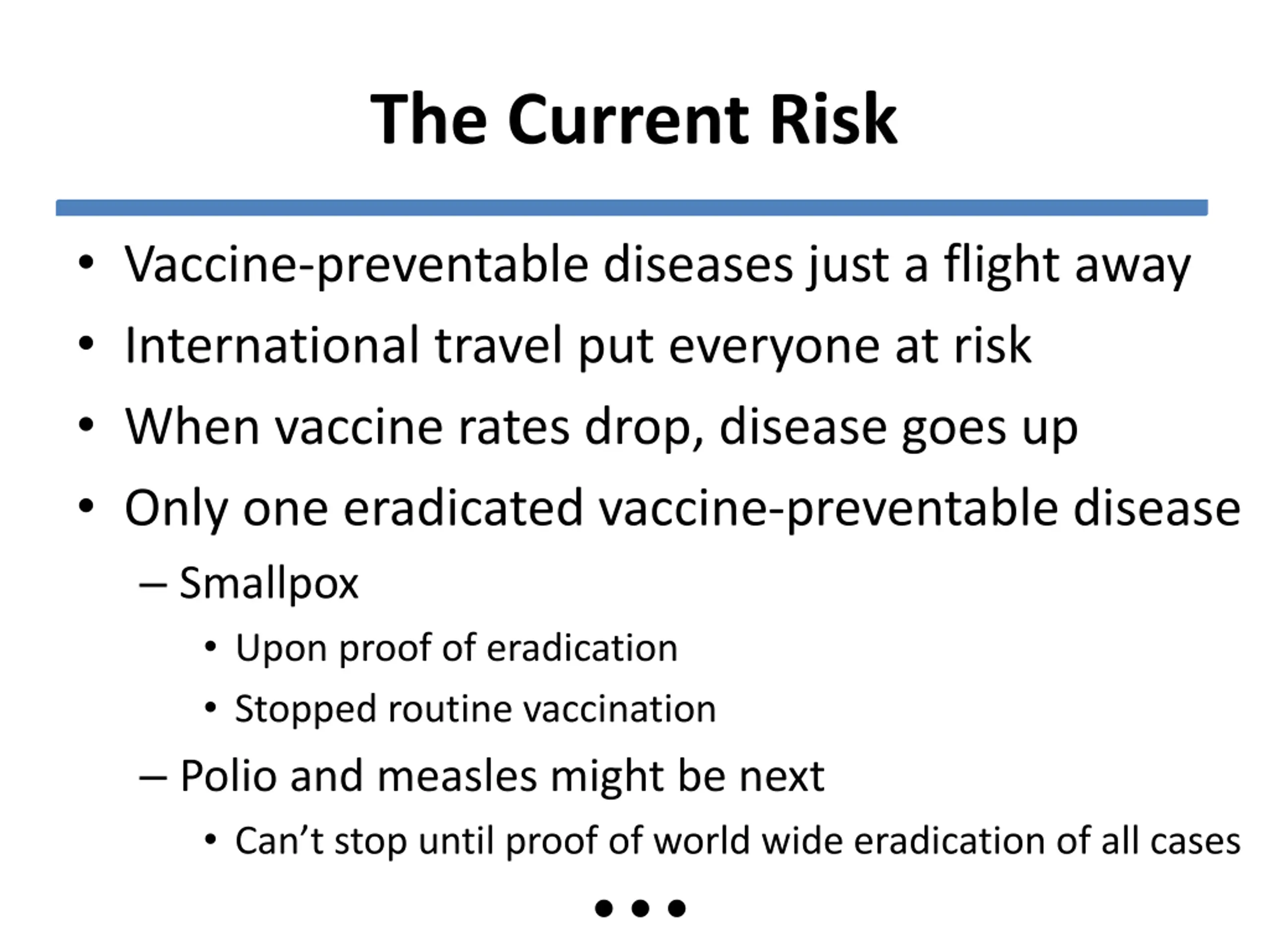 The Current Risk Vaccine-preventable diseases just a flight away International travel put everyone at risk When vaccine rates drop, disease goes up Only one eradicated vaccine-preventable disease Smallpox Upon proof of eradication Stopped routine vaccination Polio and measles might be next Can t stop until proof of world wide eradication of all cases