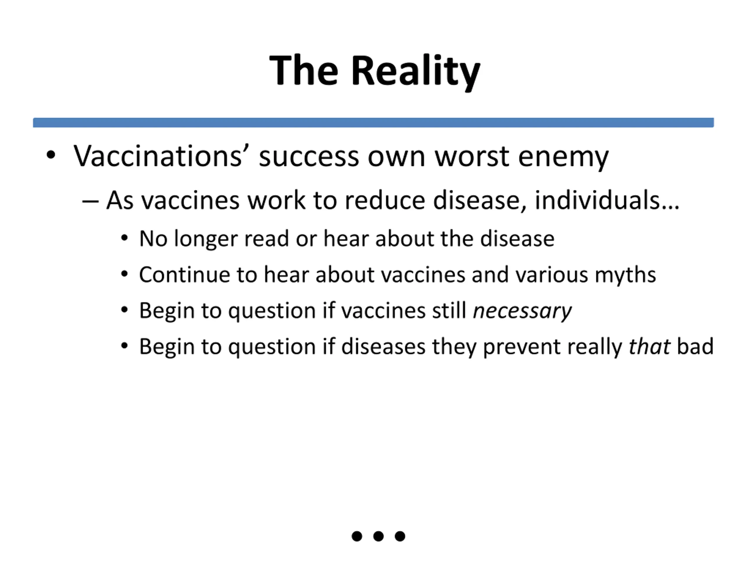 The Reality Vaccinations success own worst enemy As vaccines work to reduce disease, individuals No longer read or hear about the disease Continue to hear about vaccines and various myths Begin to question if vaccines still necessary Begin to question if diseases they prevent really that bad
