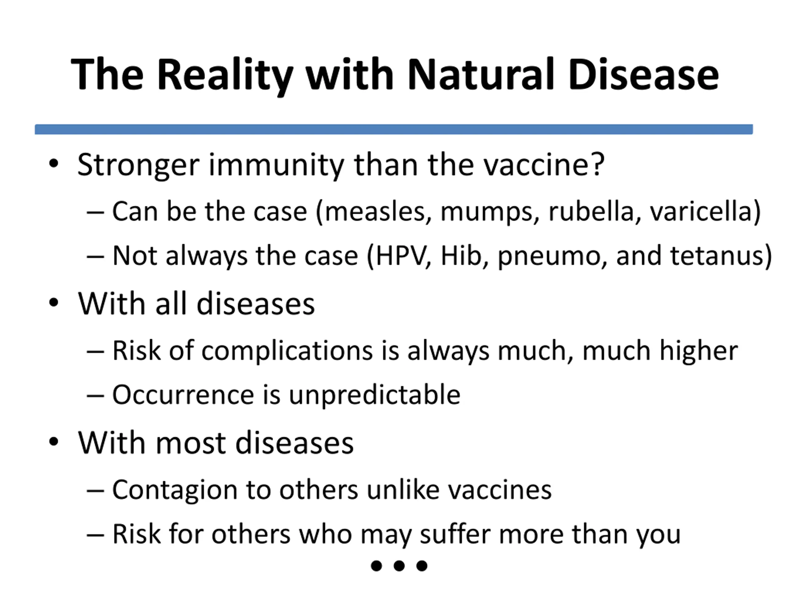 The Reality with Natural Disease Stronger immunity than the vaccine? Can be the case (measles, mumps, rubella, varicella) Not always the case (HPV, Hib, pneumo, and tetanus) With all diseases Risk of complications is always much, much higher Occurrence is unpredictable With most diseases Contagion to others unlike vaccines Risk for others who may suffer more than you