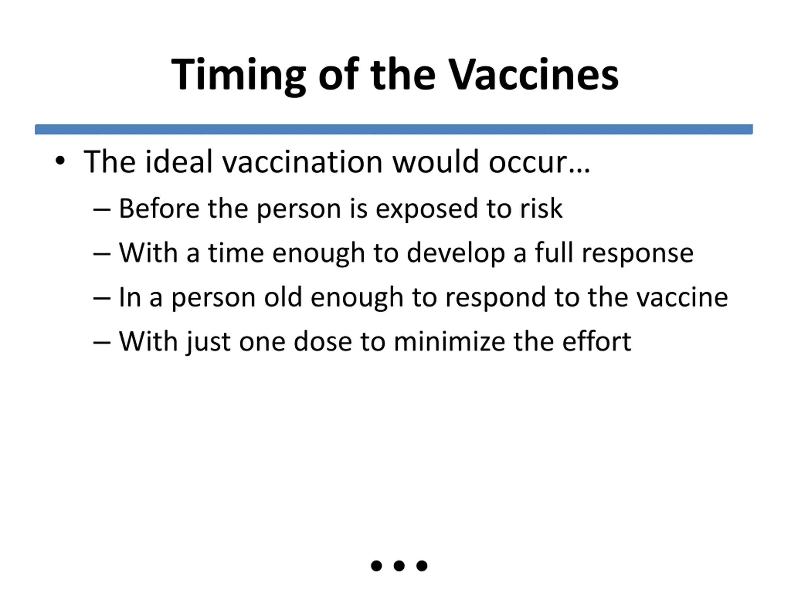 Timing of the Vaccines The ideal vaccination would occur Before the person is exposed to risk With a time enough to develop a full response In a person old enough to respond to the vaccine With just one dose to minimize the effort