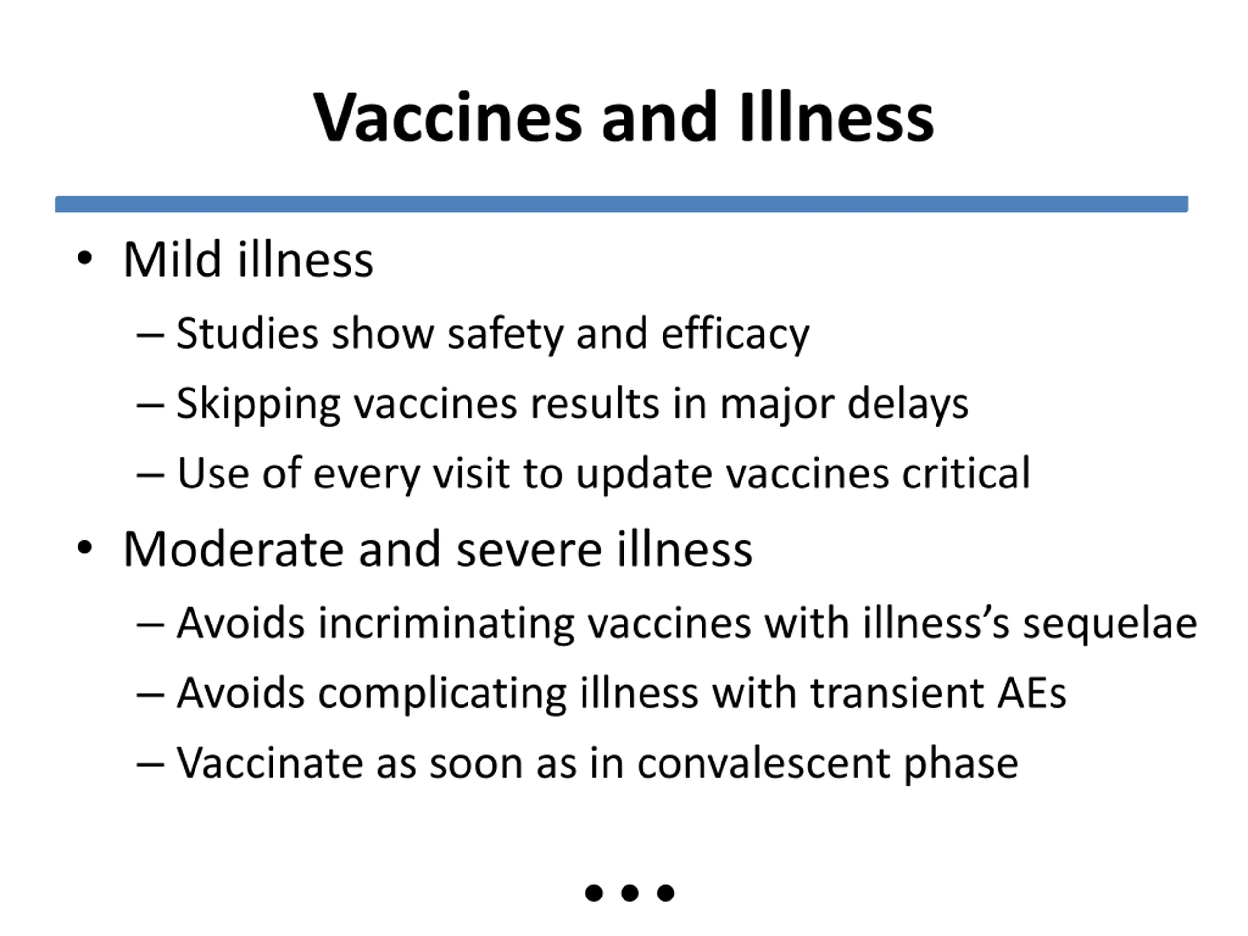 Vaccines and Illness Mild illness Studies show safety and efficacy Skipping vaccines results in major delays Use of every visit to update vaccines critical Moderate and severe illness Avoids incriminating vaccines with illness s sequelae Avoids complicating illness with transient AEs Vaccinate as soon as in convalescent phase