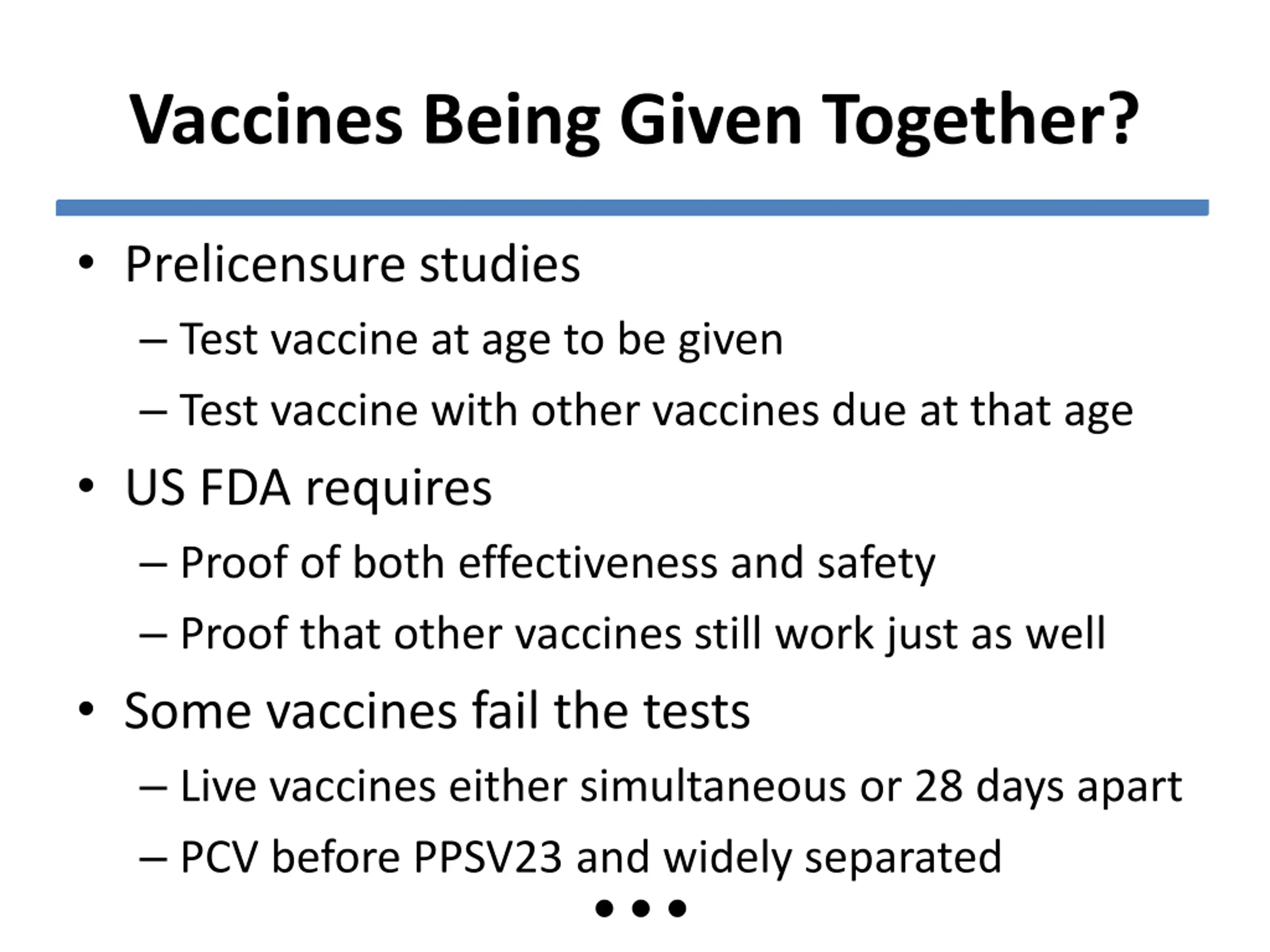 Vaccines Being Given Together? Prelicensure studies Test vaccine at age to be given Test vaccine with other vaccines due at that age US FDA requires Proof of both effectiveness and safety Proof that other vaccines still work just as well Some vaccines fail the tests Live vaccines either simultaneous or 28 days apart PCV before PPSV23 and widely separated