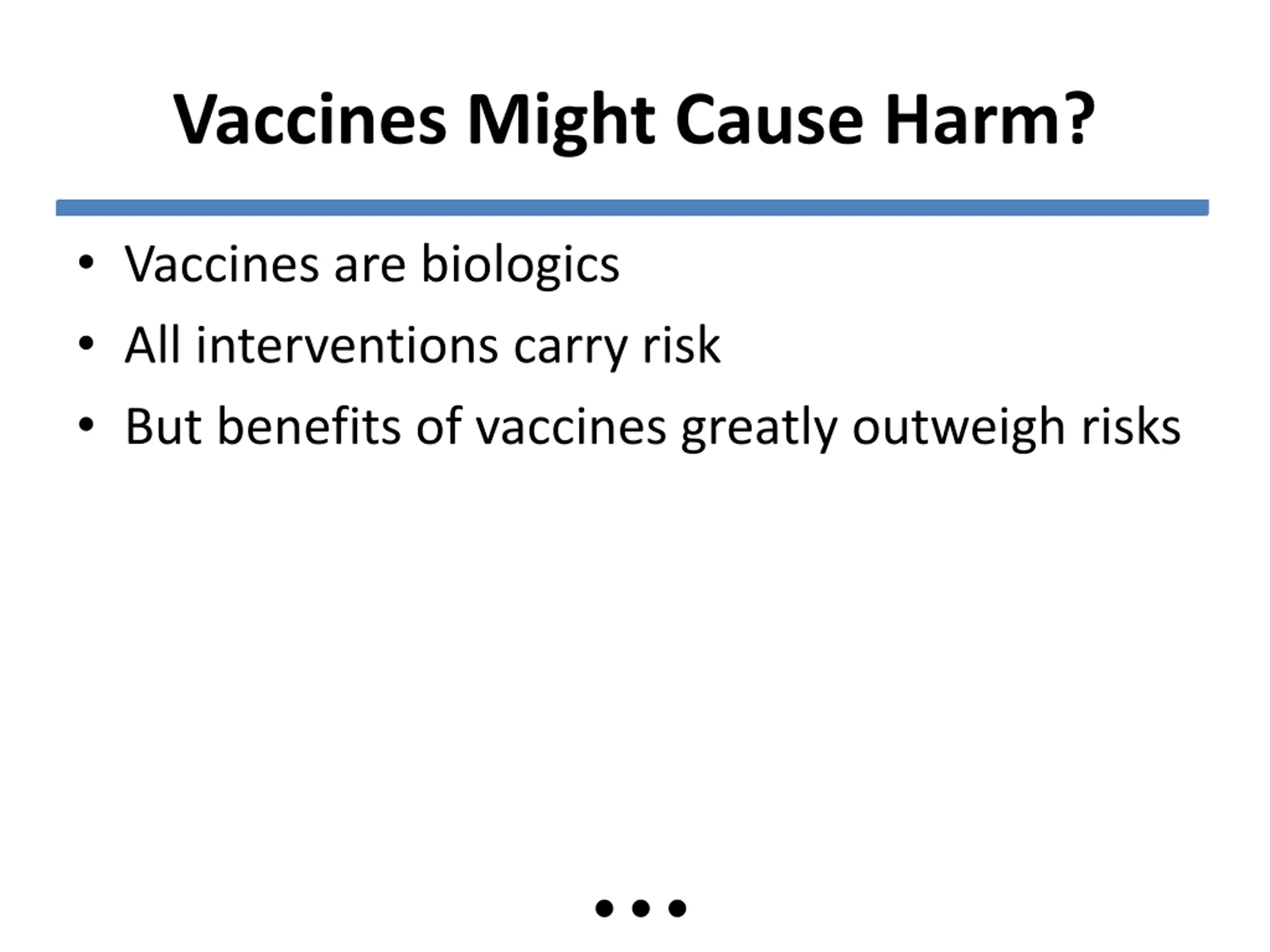 Vaccines Might Cause Harm? Vaccines are biologics All interventions carry risk But benefits of vaccines greatly outweigh risks