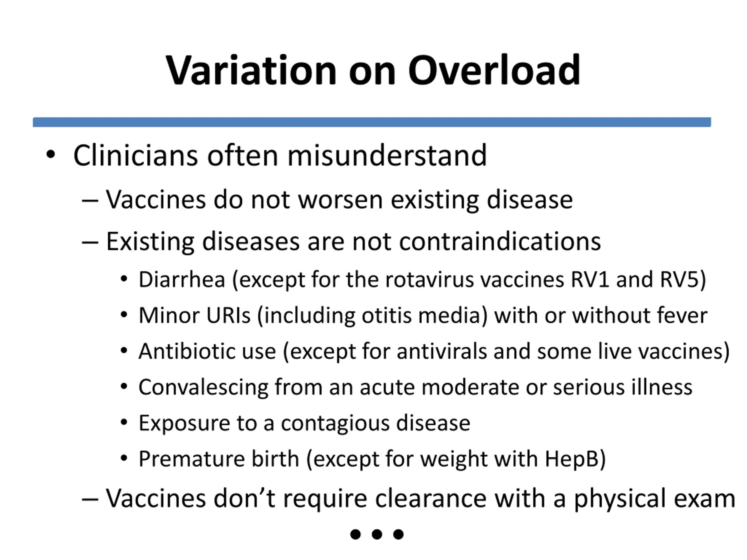 Variation on Overload Clinicians often misunderstand Vaccines do not worsen existing disease Existing diseases are not contraindications Diarrhea (except for the rotavirus vaccines RV1 and RV5) Minor URIs (including otitis media) with or without fever Antibiotic use (except for antivirals and some live vaccines) Convalescing from an acute moderate or serious illness Exposure to a contagious disease Premature birth (except for weight with HepB) Vaccines don t require clearance with a physical exam