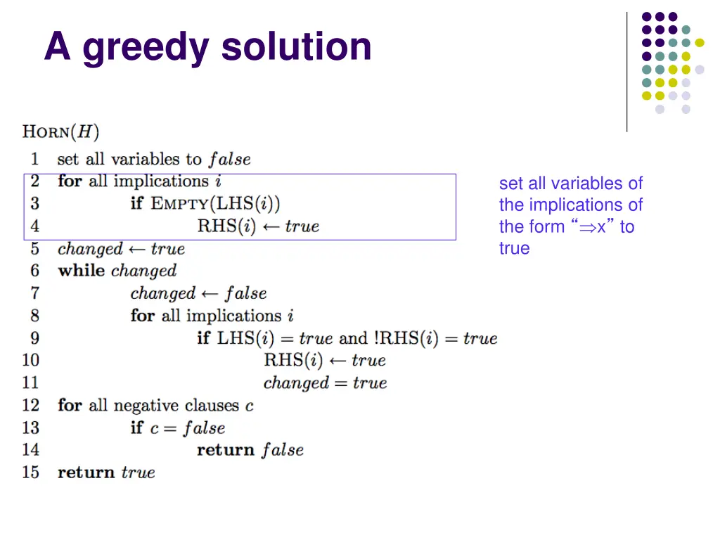 A greedy solution How is this a greedy algorithm? Make a greedy decision about which variables to set and then moves on