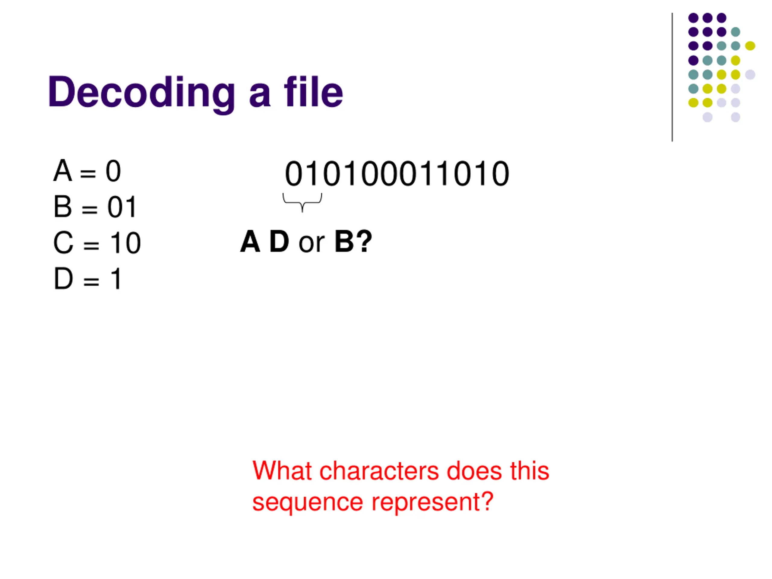 Decoding a file 010100011010 A = 0 B = 01 C = 10 D = 1 A D or B? What characters does this sequence represent?