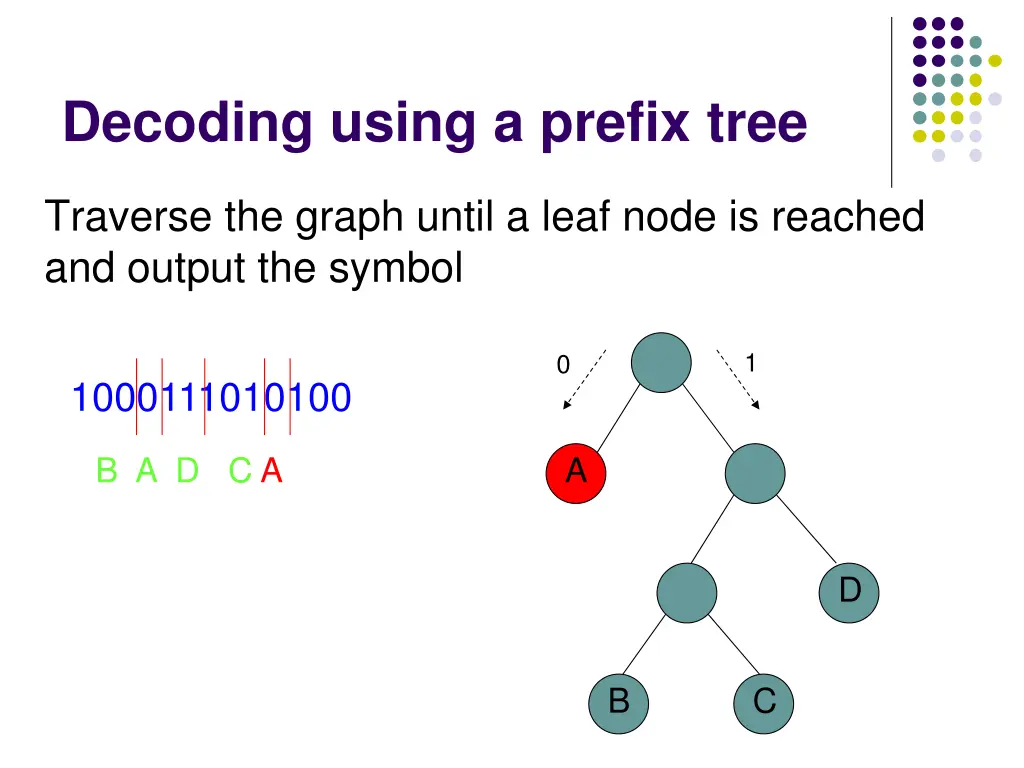 Decoding using a prefix tree To decode, we traverse the graph until a leaf node is reached and output the symbol 1 0 A A = 0 B = 100 C = 101 D = 11 D B C