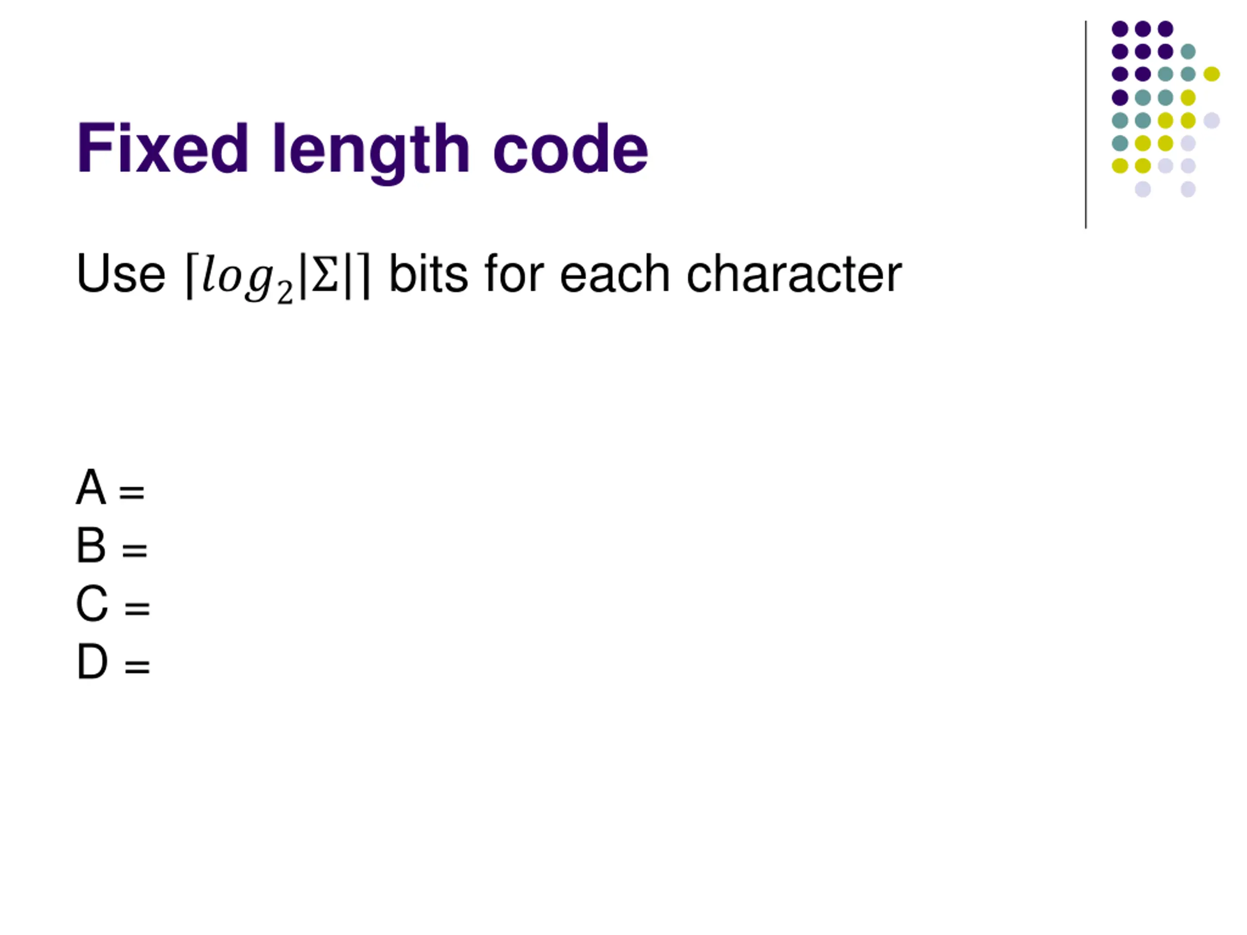 Fixed length code Use ???2 bits for each character A = B = C = D =